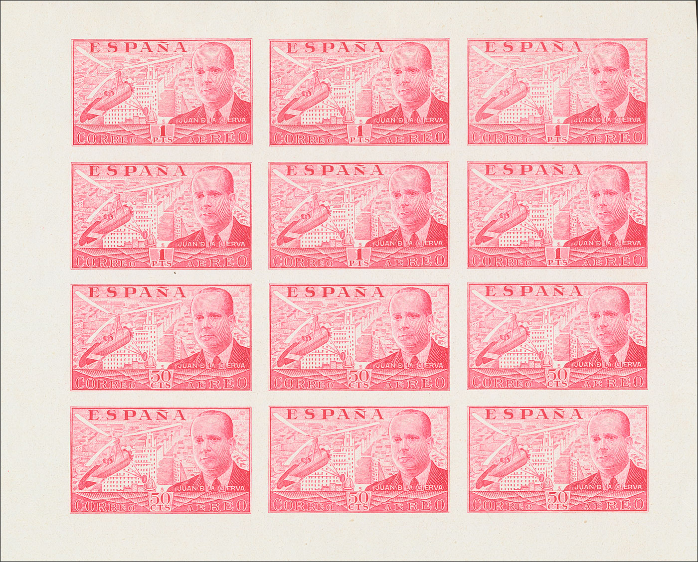 ★ 883/84P. 1939. 50 cts y 1 pts carmÃn. PRUEBA DEL BLOQUE REPORTE (doce valores, seis de cada valor). MAGNIFICA Y EXTRAORDINARIAMENTE RARA.