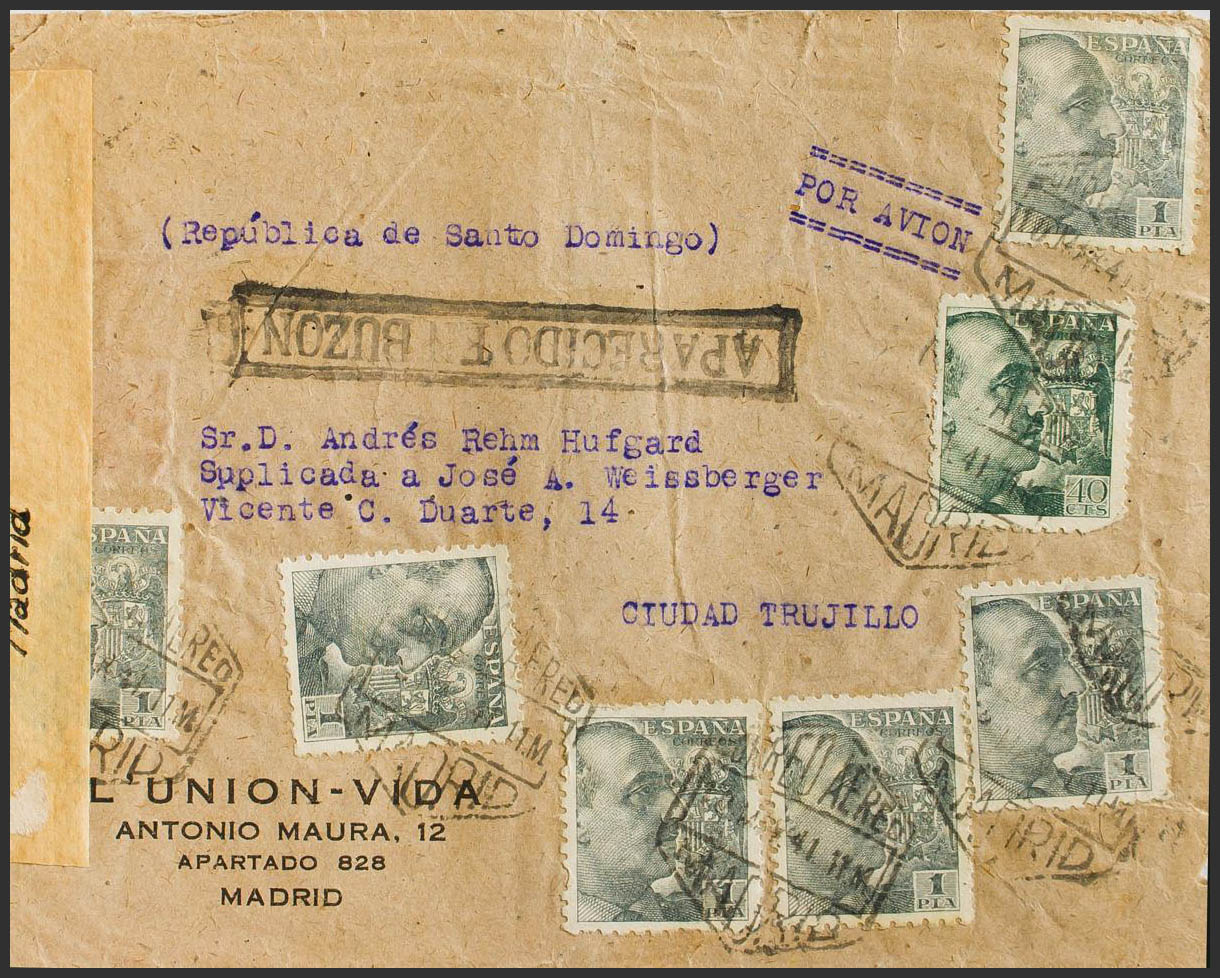 930(6), 925. 1941. 1 pts negro, seis sellos y 40 cts verde. MADRID a CIUDAD TRUJILLO (REPUBLICA DOMINICANA), se da la circunstancia de que el nombre de la capital, Santo Domingo, se cambió por el de Ciudad Trujillo durante la dictadura de Leónidas Trujillo. En el frente marca APARECIDO EN BUZON, al dorso llegada. MAGNIFICA Y RARA.