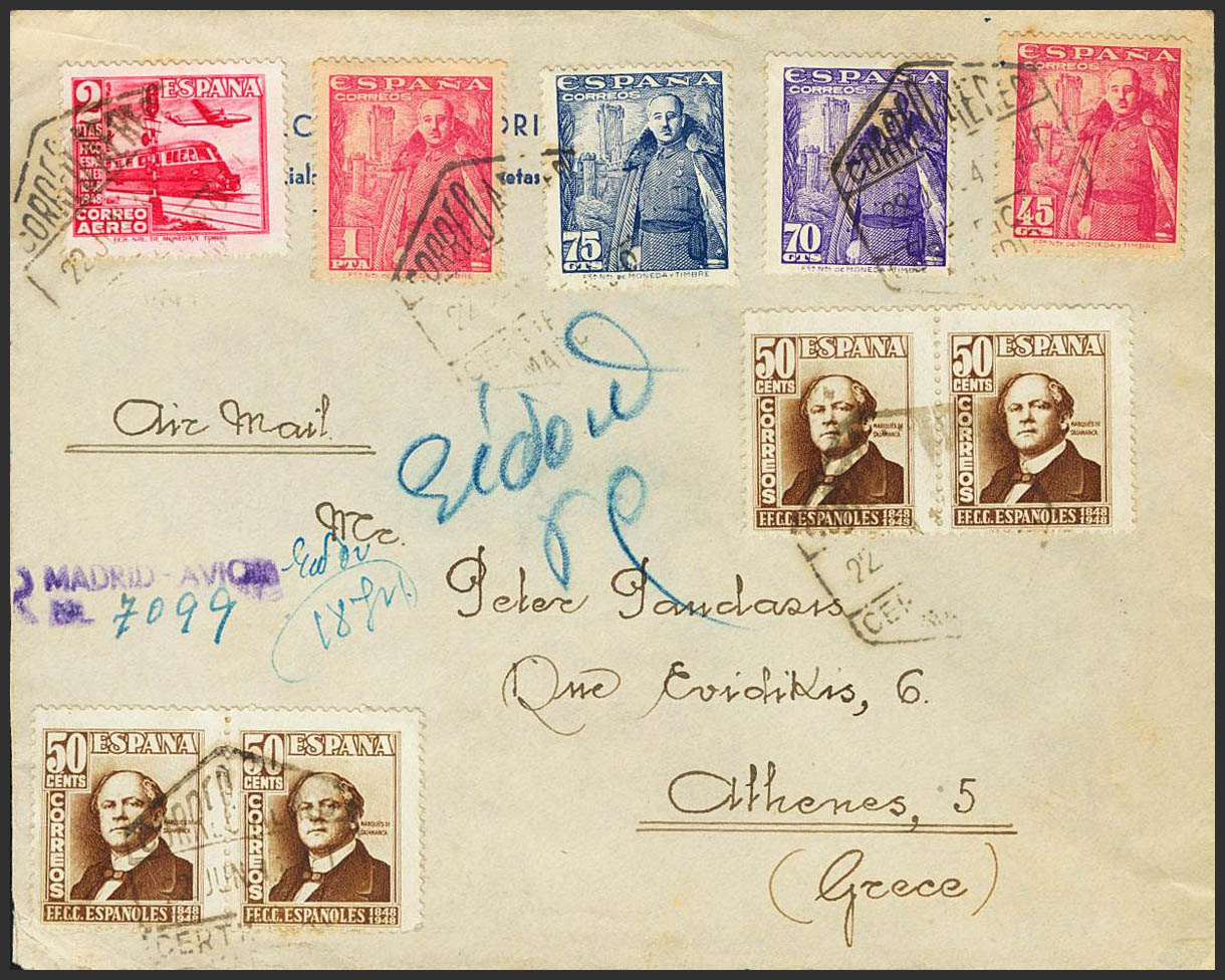 Estado Español Correo Aéreo. Dirigida a GRECIA. Al dorso llegada. MAGNIFICA Y ESPECTACULAR FRANQUEO.