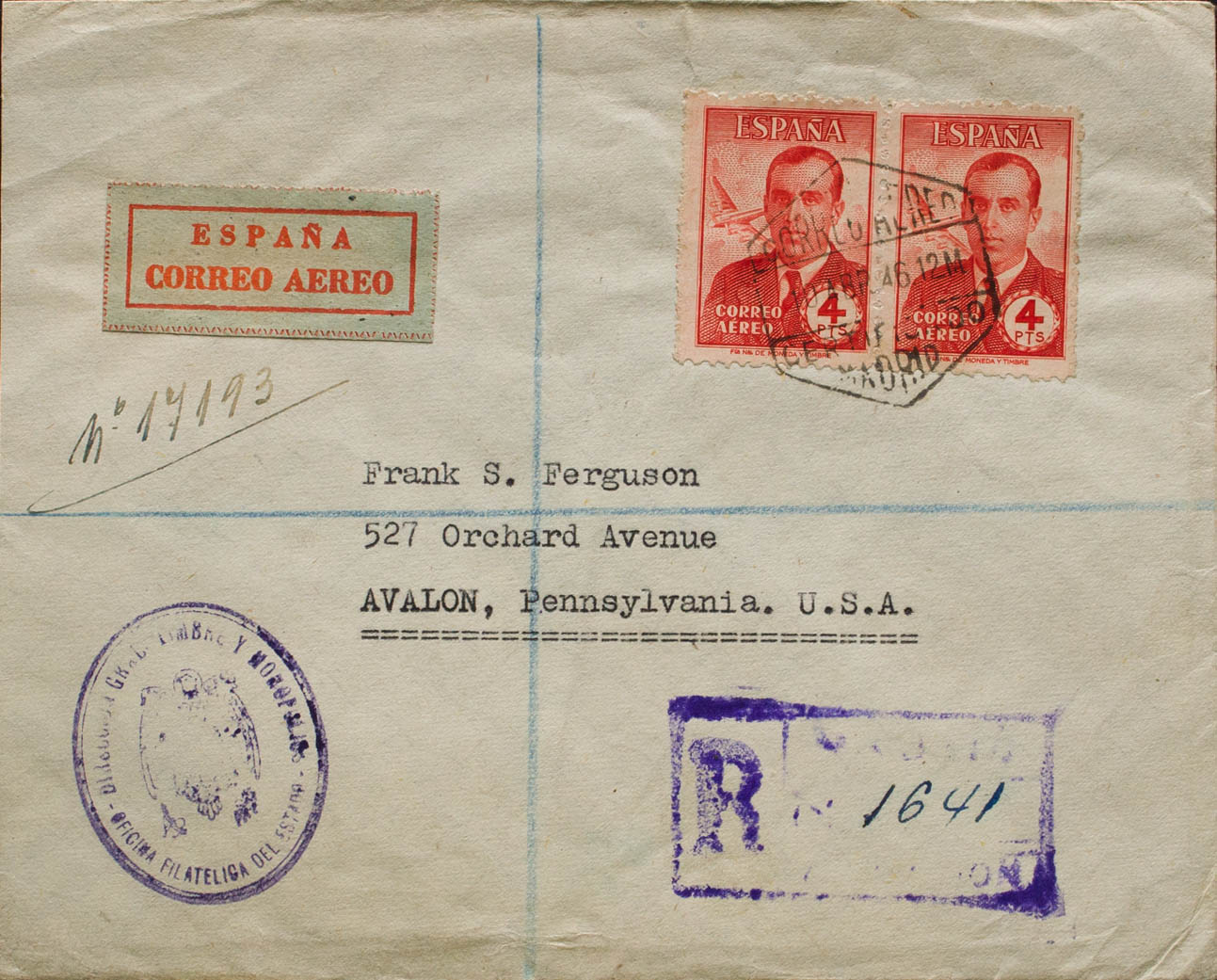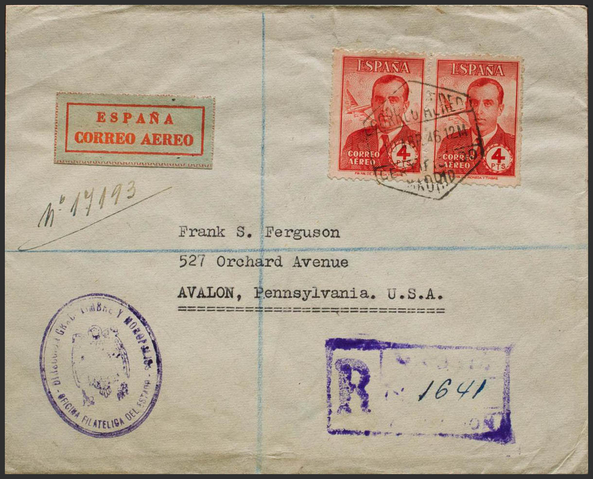991(2). 1946. 4 pts rojo, dos sellos. Certificado de MADRID a AVALON (U.S.A.). Al dorso etiqueta de exportación y llegada. MAGNIFICA.
