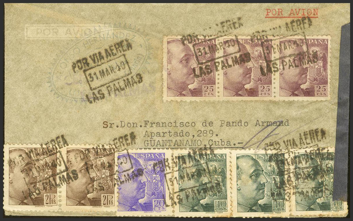 Estado Español Correo Aéreo. POR VIA AEREA / LAS PALMAS, al dorso llegada. MAGNIFICA.