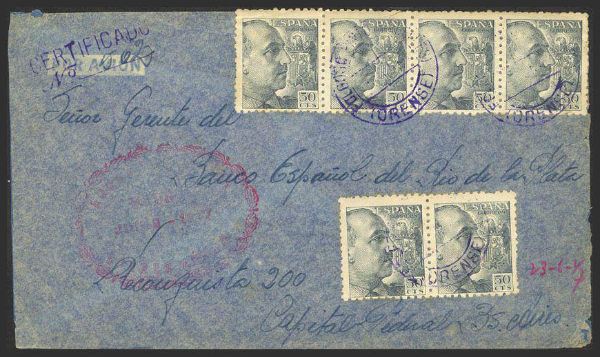 927(6). 1947. 50 cts, tira de cuatro y pareja. Certificado de ORENSE a BUENOS AIRES. En el frente marca especial. MAGNIFICA.