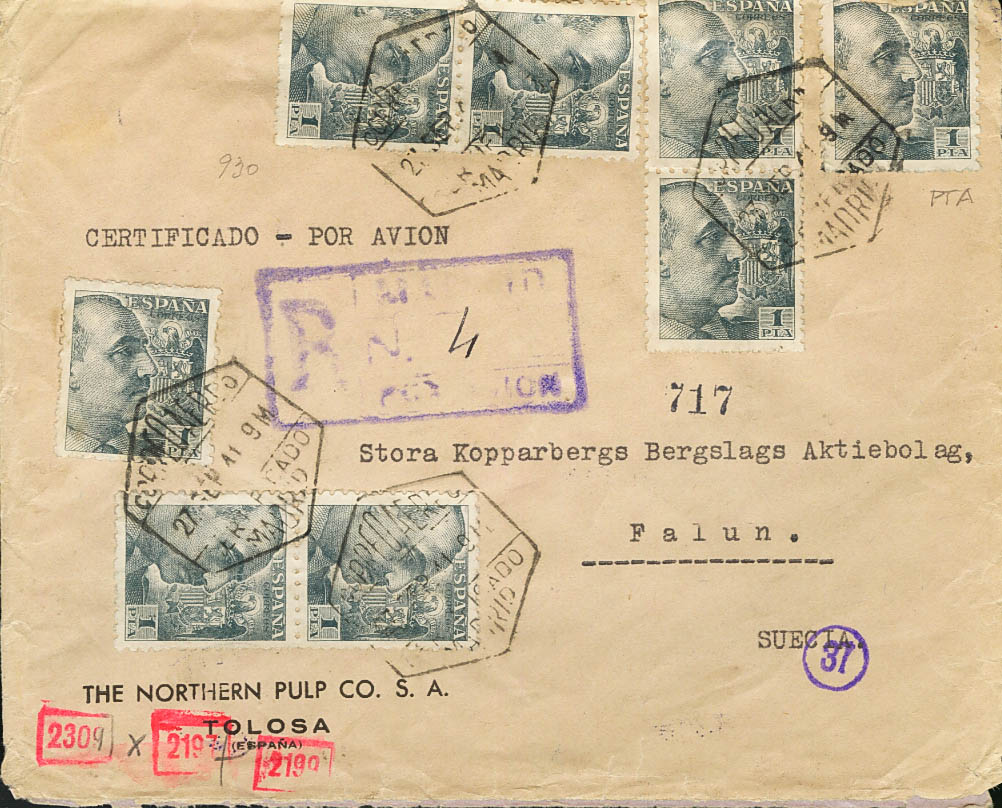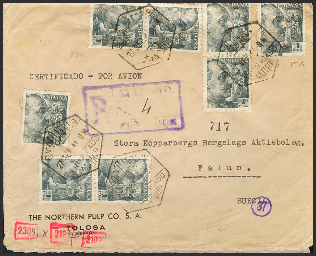 Estado Español Correo Aéreo. Dirigida a SUECIA. ESPECTACULAR FRANQUEO.