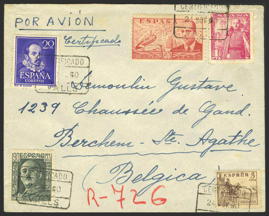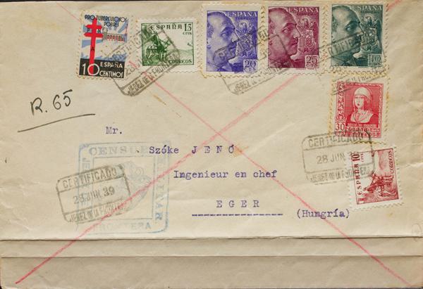 859(2), 815(4), 817, 843. 1939. 50 cts pizarra, dos sellos y diversos valores. Certificado de BARCELONA a BASILEA (SUIZA). Al dorso llegada. MAGNIFICA Y RARA COMBINACION DE FRANQUEO CIRCULADA DOS DIAS DESPUES DEL FINAL DE LA GUERRA CIVIL.
