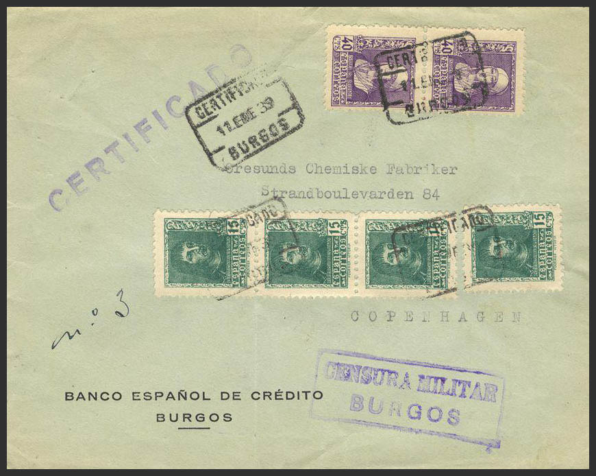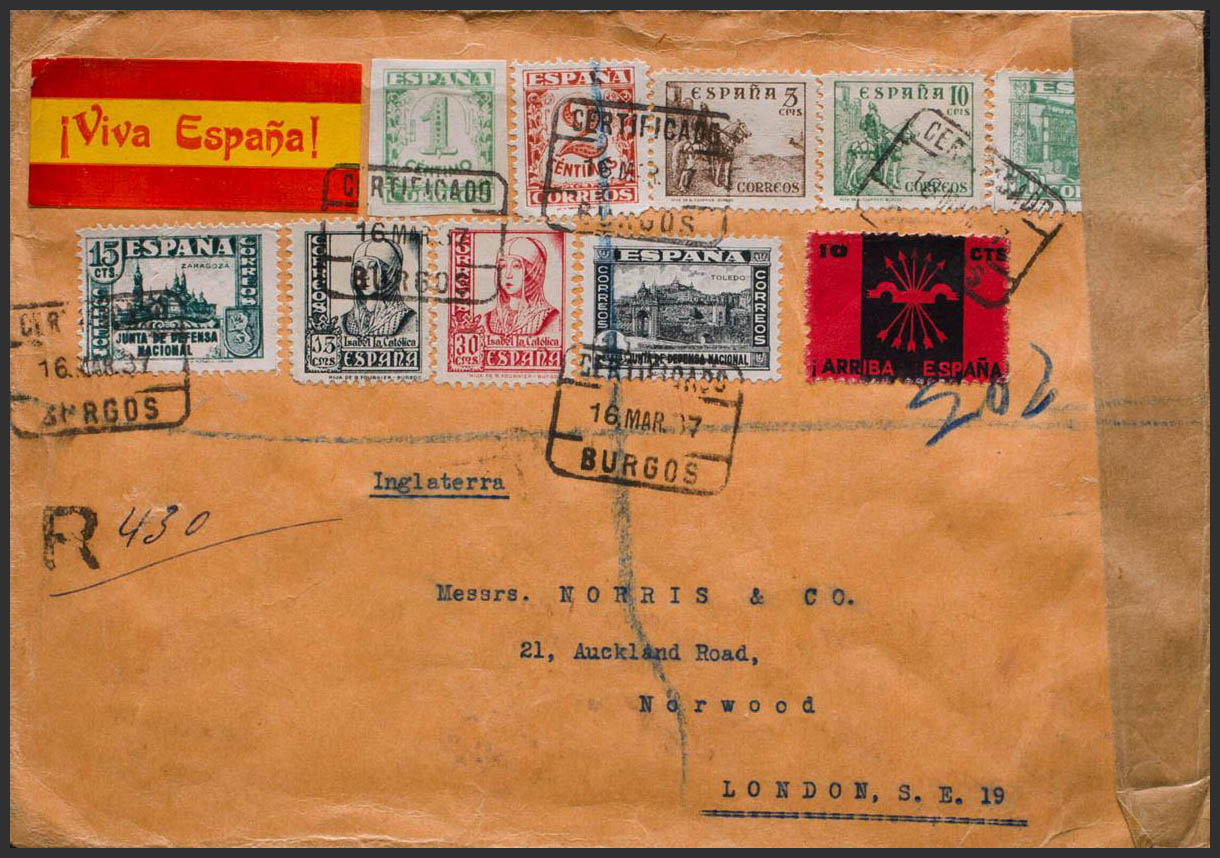802/03. 1937. Diversos valores. Certificado de BURGOS a LONDRES. Al dorso llegada. MAGNIFICA Y ESPECTACULAR FRANQUEO.