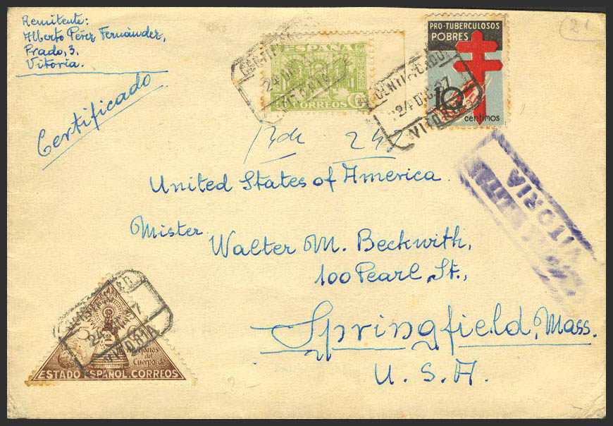 840. 1937. 10 cts, Protuberculoso. VITORIA a USA. Al dorso llegada. MAGNIFICA Y RARA.