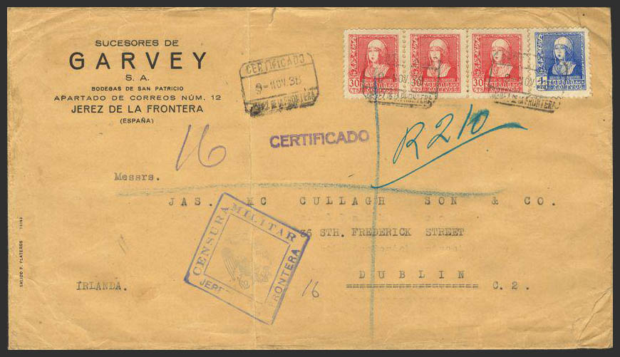 857(3), 860. 1938. 30 cts, tira de tres y 1 pts. Certificado de JEREZ DE LA FRONTERA a DUBLIN. MAGNIFICO.
