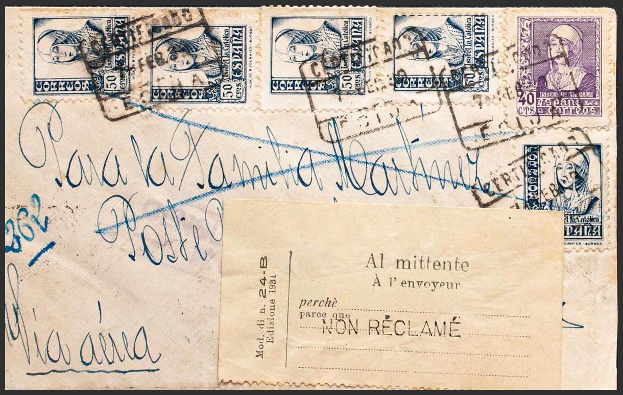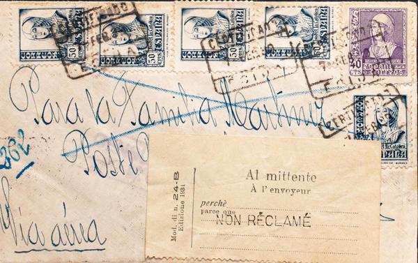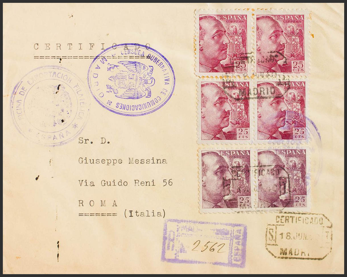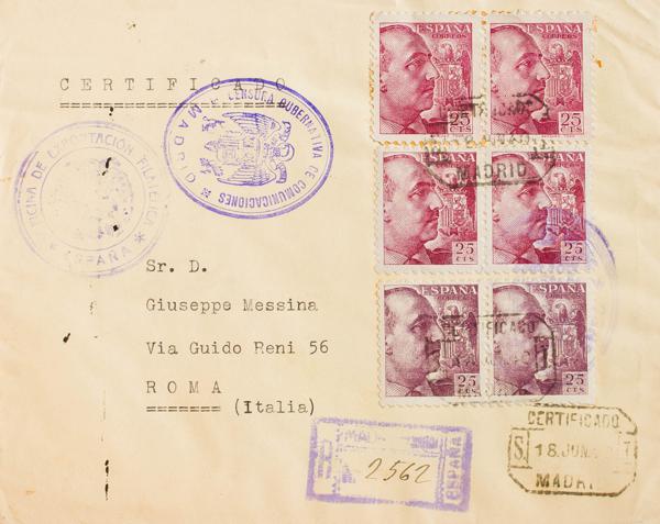 817(9), 820, 822(3). 1938. 10 cts verde, nueve sellos, 15 cts pizarra y 25 cts carmÃn, tres sellos. Certificado de SAN FERNANDO a PISA (ITALIA). Al dorso llegada (recorte sin importancia de lo que podrÃa ser un sello Benéfico). MAGNIFICA.