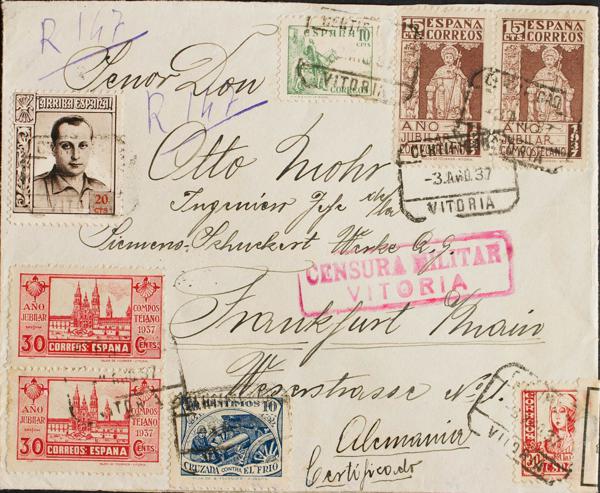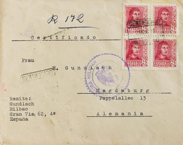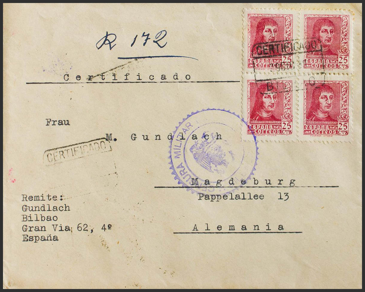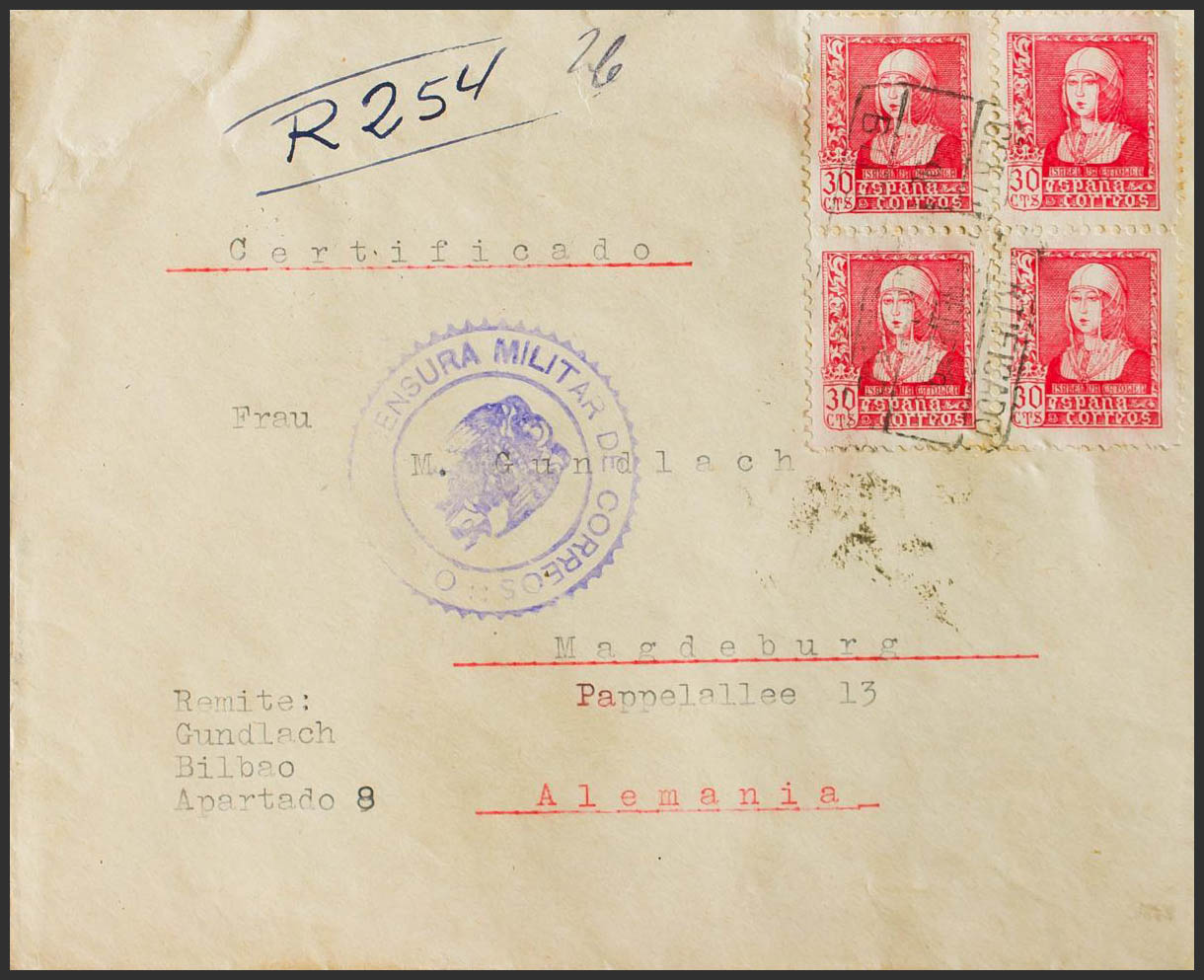 857(2), 860(2), 816B. 1939. 30 cts rosa, pareja, 1 pts azul, pareja y 5 cts castaño. Certificado de BILBAO a MAGDEBURGO (ALEMANIA). Al dorso banda de censura alemana y llegada. MAGNIFICA.