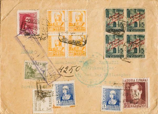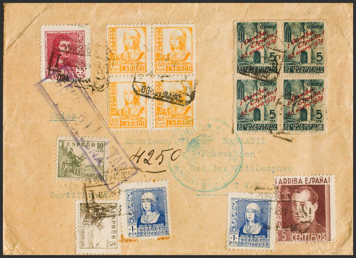 826(4), 843, 860(2). 1939. 60 cts amarillo, bloque de cuatro, 5 cts verde de Ayuntamiento de Barcelona, bloque de cuatro y diversos valores. Certificado de BARCELONA a GINEBRA (SUIZA). MAGNIFICA.