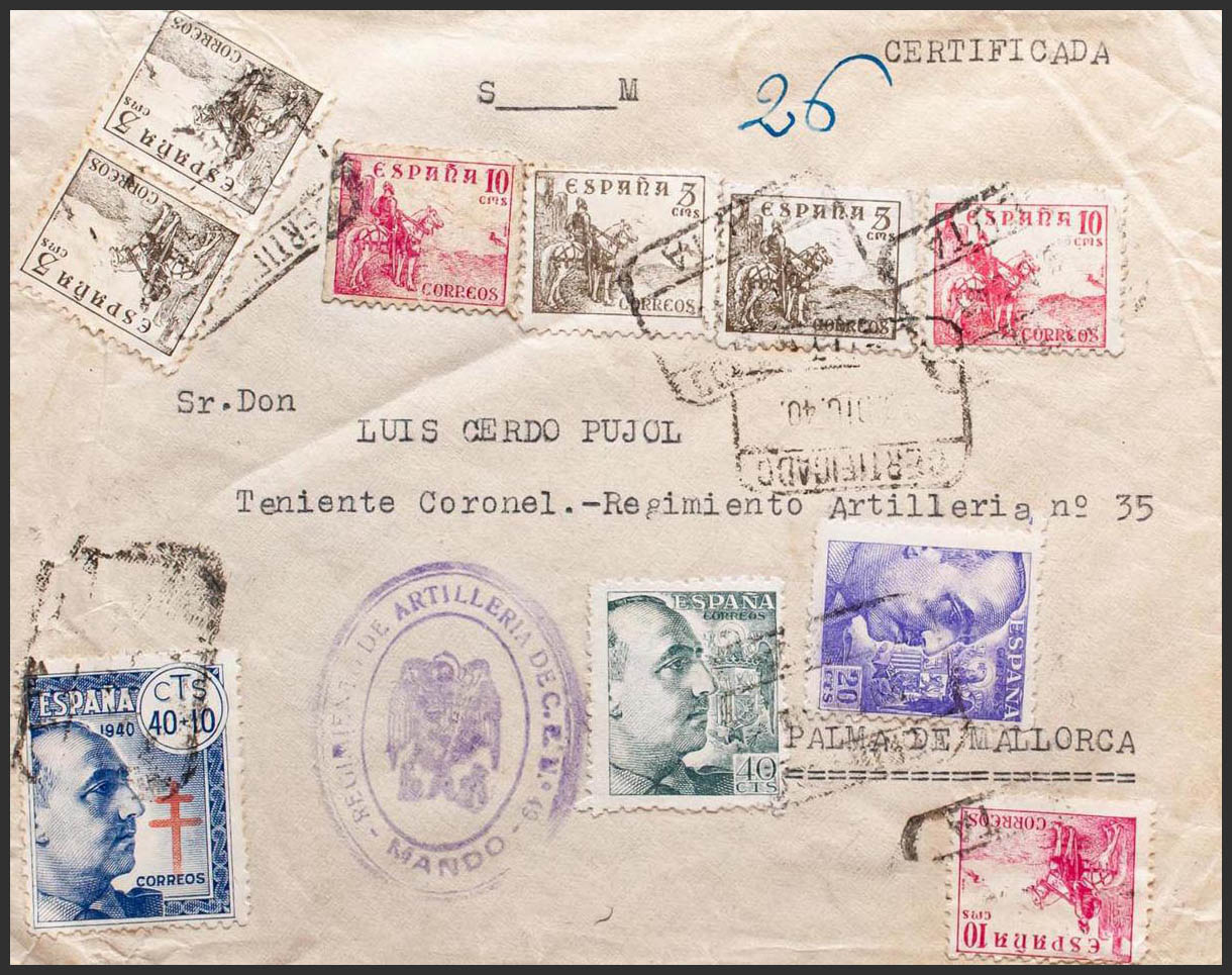 938, 922, 925, 916(4), 917(3). 1940. 40 cts + 10 cts azul y diversos valores. Certificado de CEUTA a PALMA DE MALLORCA. En el frente marca de franquicia REGIMIENTO DE ARTILLERIA DE C.E.N. Nº49 / MANDO, en violeta y al dorso llegada. MAGNIFICA.