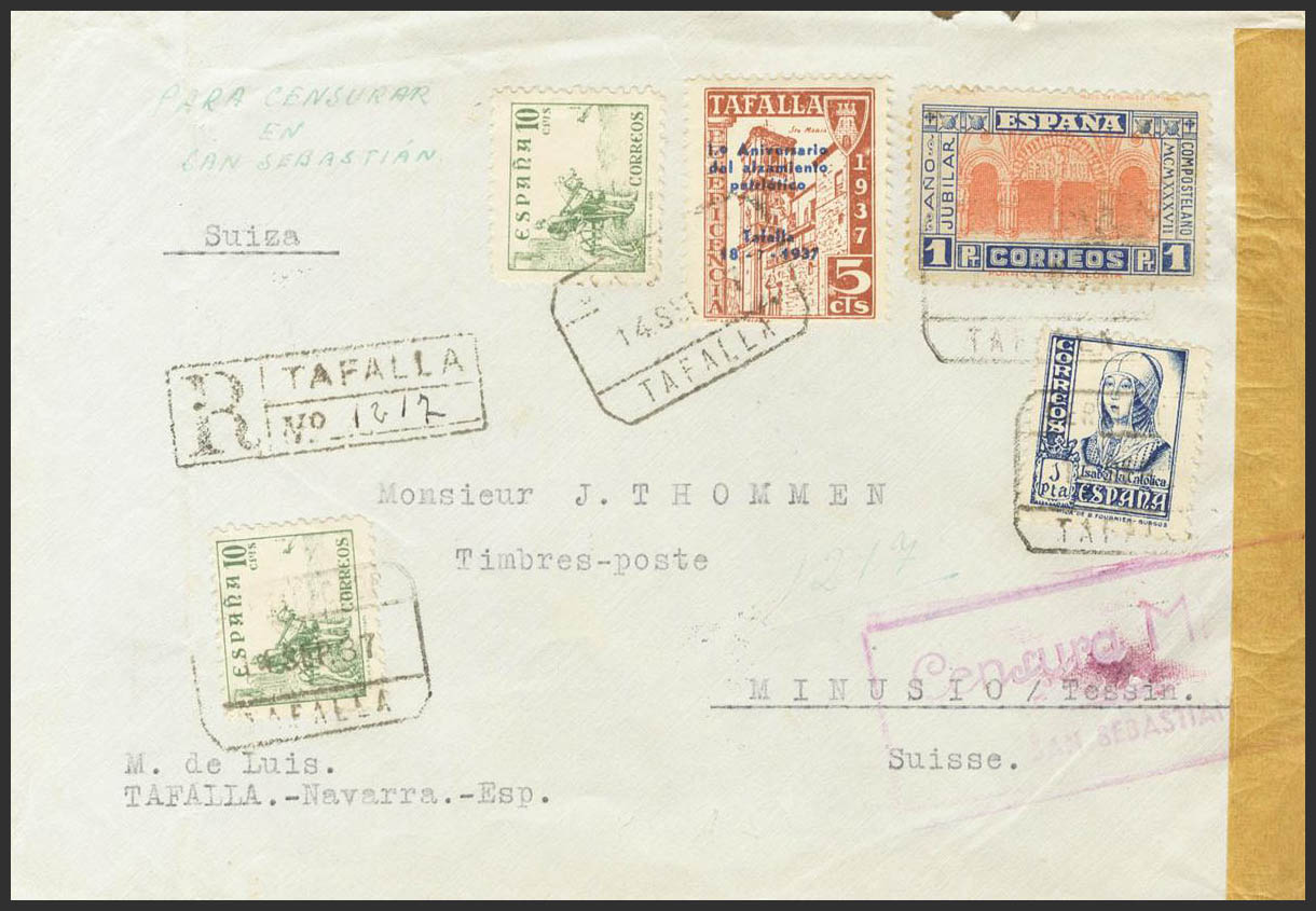 835, 817(2), 828. 1937. 1 pts azul y naranja, 10 cts verde, dos sellos, 1 pts azul y Local de 5 cts de Tafalla. Certificado de TAFALLA a MINUSIO (SUIZA). Al dorso llegada. MAGNIFICA.
