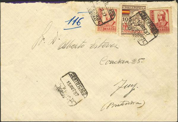 808(3), 817. 1937. 30 cts rosa, tres sellos y 10 cts verde. Certificado de BURGOS a HEIDENHEIM (ALEMANIA). Al dorso llegada. MAGNIFICA.