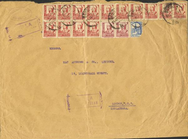 822(2), 823(14). 1937. 25 cts, pareja, 30 cts, catorce sellos y 5 cts sello local SEVILLA. SEVILLA a LONDRES. MAGNIFICA.