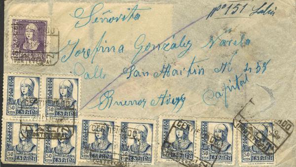 825(13), 859. 1939. 40 cts lila, 50 cts azul trece sellos. Certificado de PONTEVEDRA a BUENOS AIRES. Al dorso llegada, posiblemente se haya desprendido un sello. MAGNIFICA.