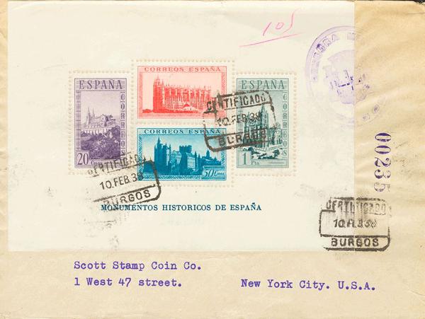 847. 1938. Hoja bloque. BURGOS a NUEVA YORK (USA). Al dorso llegada. MAGNIFICA.