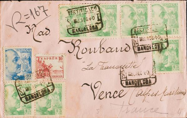 921(7), 924, 917. 1940. 15 cts verde, siete sellos, 30 cts azul y 10 cts rosa. Certificado de BARCELONA a VENCE (FRANCIA). MAGNIFICA.