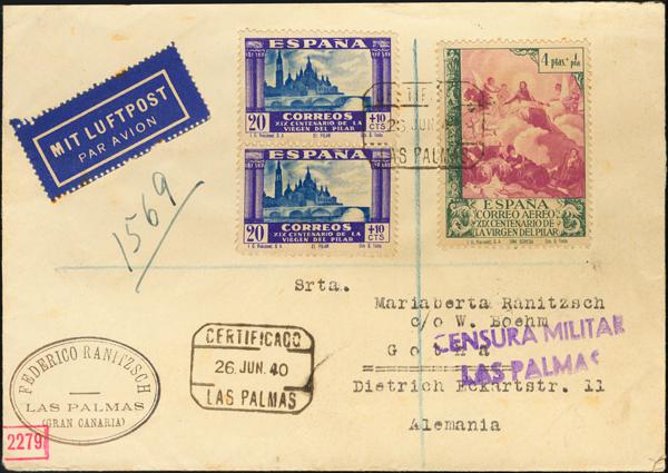 912, 891(2). 1940. 4 pts + 1 pts verde y lila y 20 cts + 10 cts violeta y azul, dos sellos. Certificado de LAS PALMAS a GOTHA (ALEMANIA). Al dorso llegada. MAGNIFICA Y MUY RARA CON EL 4 PTS VERDADERAMENTE CIRCULADA.