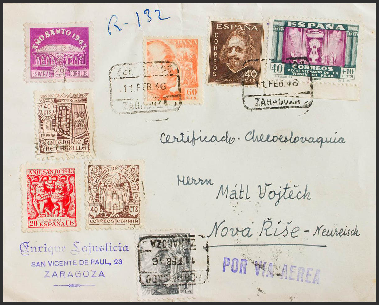 893, 928, 930, 989. 1946. 40 cts + 10 cts verde y lila, 60 cts naranja, 1 pts negro y valores diversos. Certificado de ZARAGOZA a NOVA RISE (CHECOSLOVAQUIA). Al dorso llegada. MAGNIFICA E INUSUAL DESTINO.