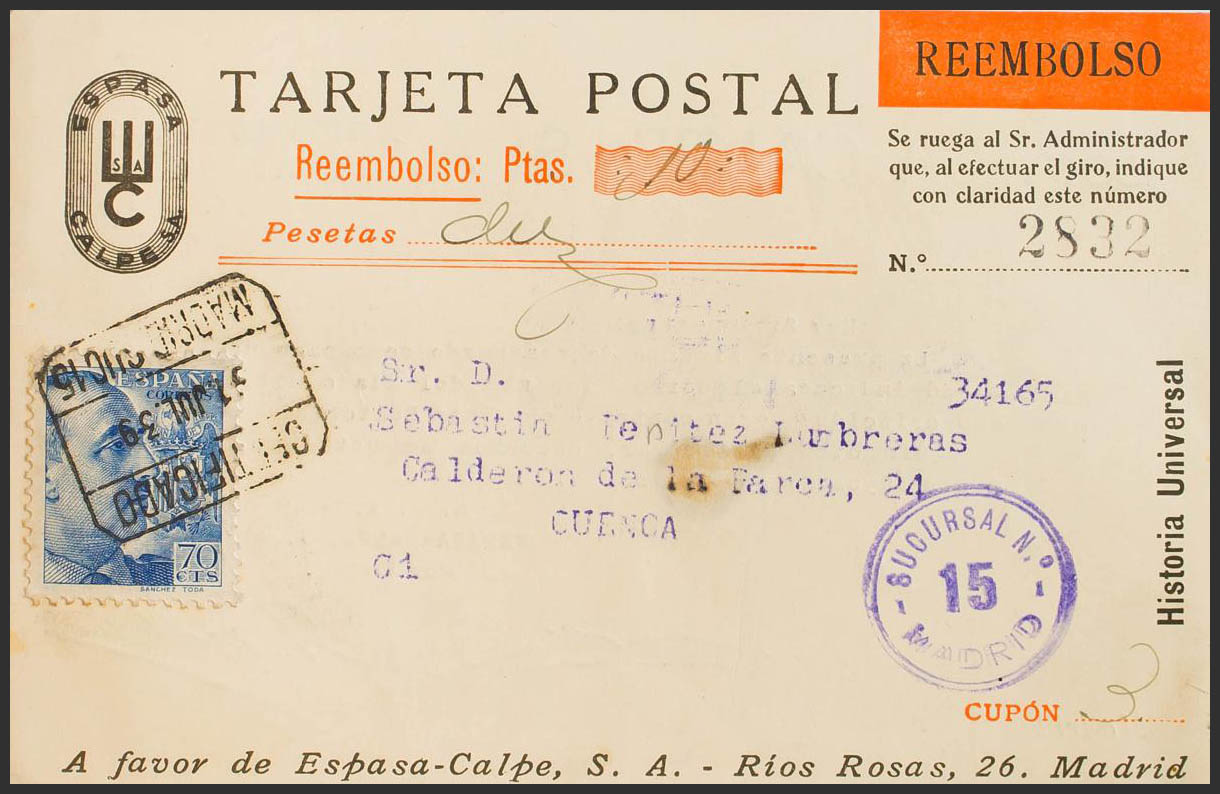 874. 1939. 70 cts azul. Tarjeta Postal "Espasa Calpe" Certificada y Contrarreembolso de MADRID a CUENCA. MAGNIFICA Y RARA.