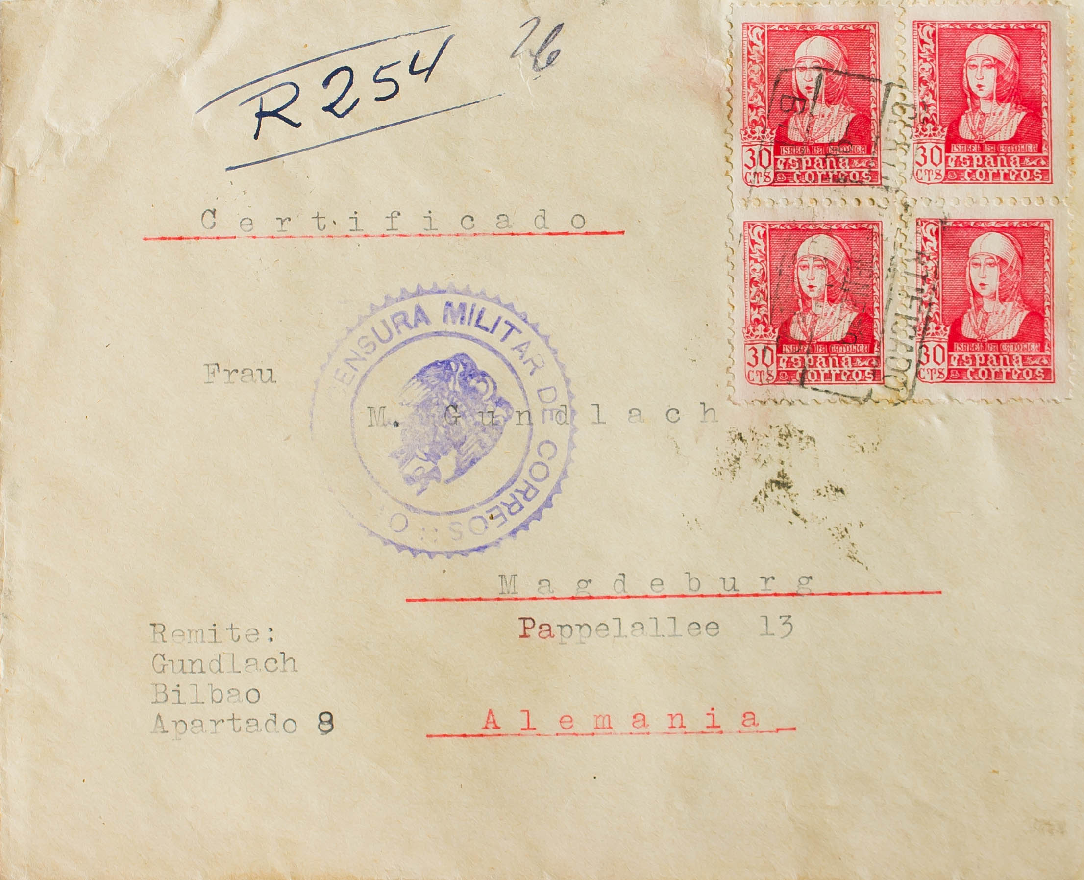 857(4). 1939. 30 cts rosa, bloque de cuatro. Certificado de BILBAO a MAGDEBURG (ALEMANIA). Al dorso llegada. MAGNIFICA.