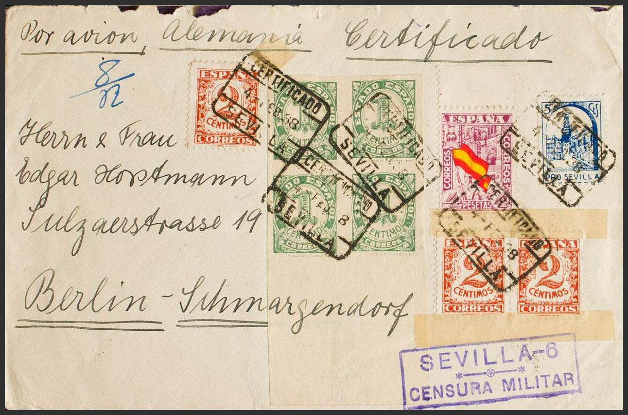 812, 802(4), 803(3). 1938. 4 pts. Carta Aérea Certificada de SEVILLA a BERLIN. Al dorso llegada. MAGNIFICA.