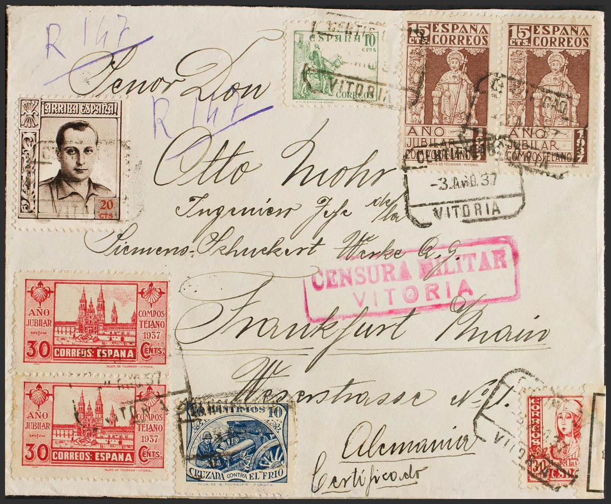 833(2). 1937. 15 cts, pareja y 30 cts, pareja. Certificado de VITORIA a FRANKFURT (ALEMANIA). Al dorso llegada. MAGNIFICA Y ESPECTACULAR.