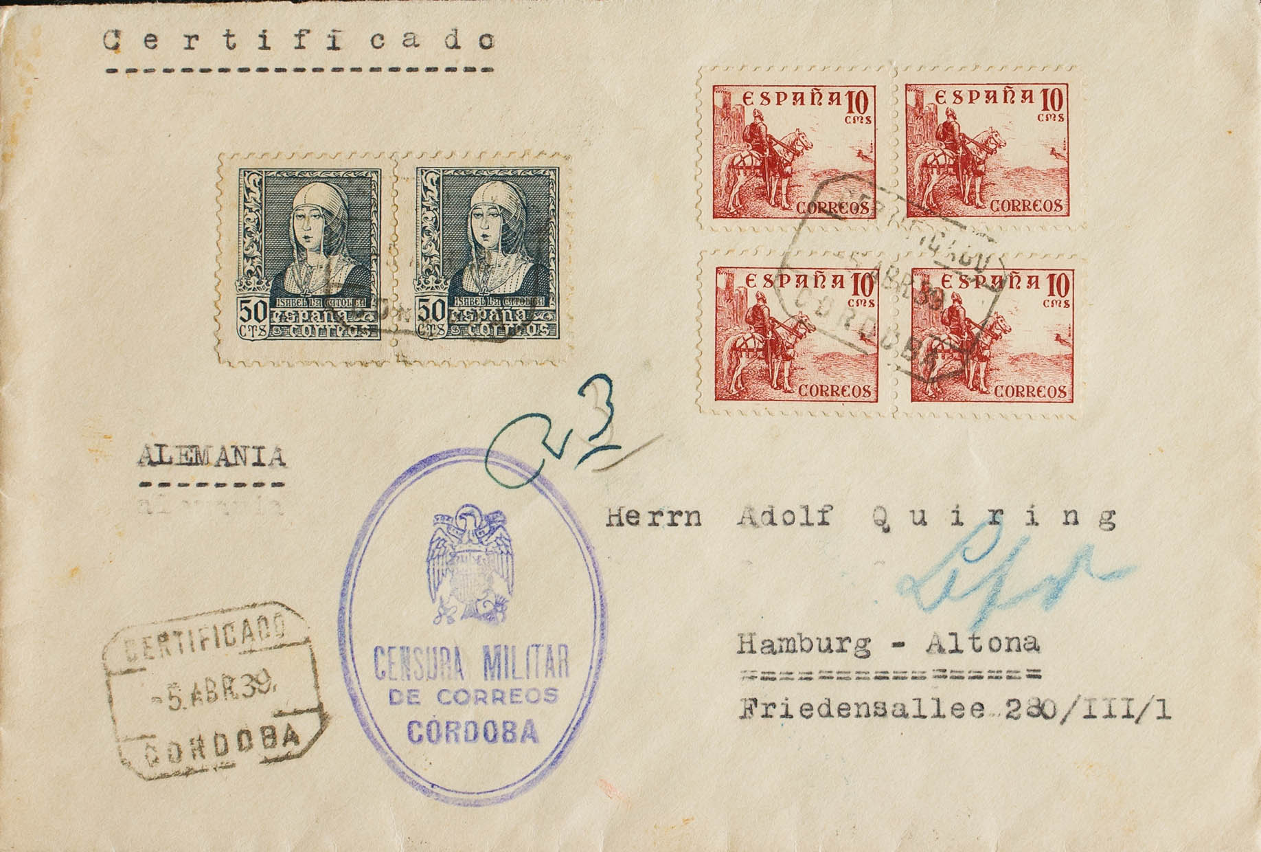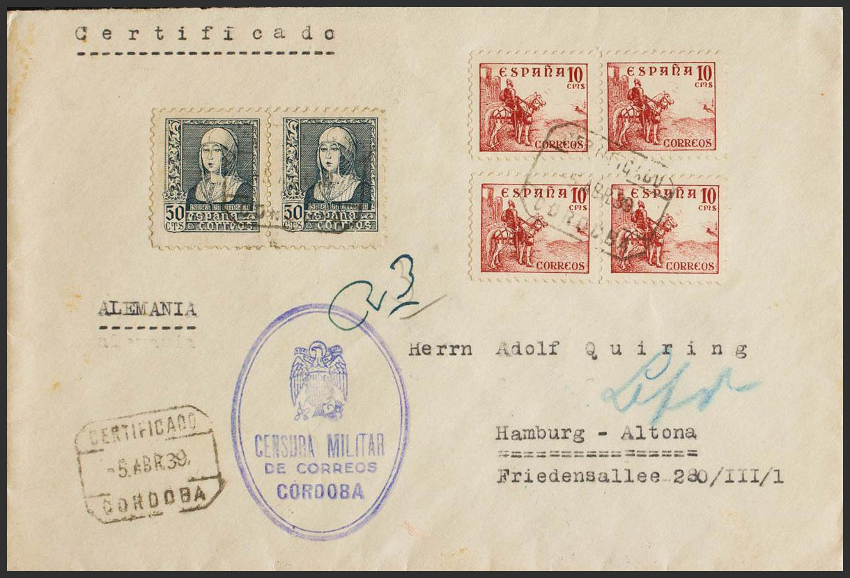 Estado Español Correo Certificado. Al dorso llegada. CERTIFICADO / CORDOBA. MAGNIFICA.