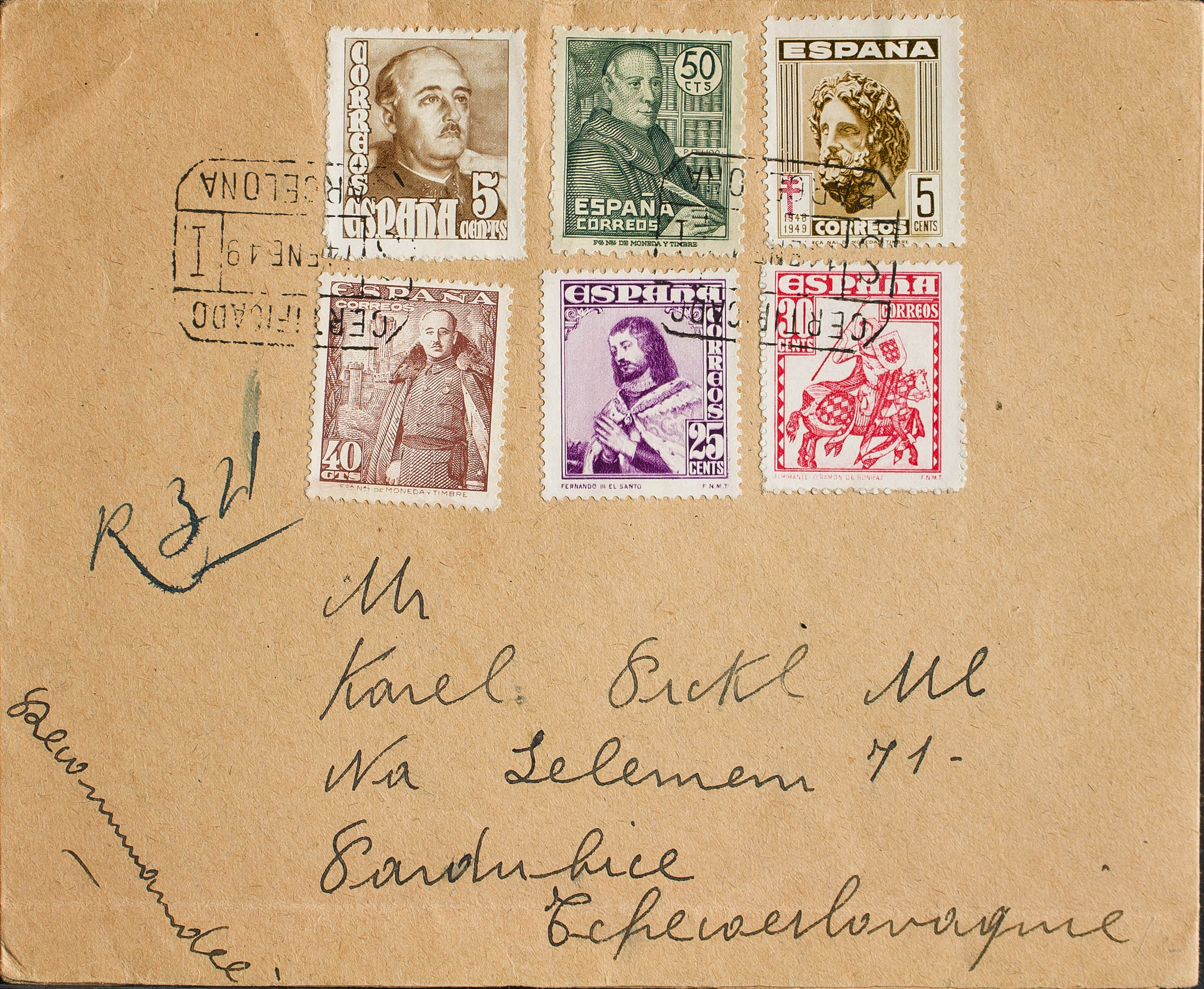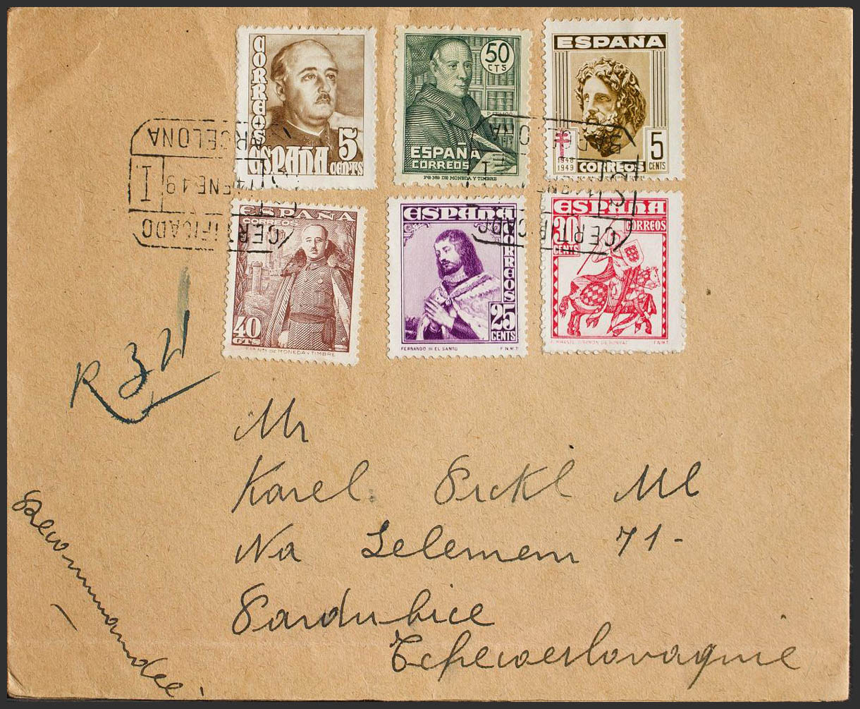 1011. 1949. 50 cts verde. Certificado de BARCELONA a CHECOSLOVAQUIA. Al dorso llegada. MAGNIFICA Y ESPECTACULAR FRANQUEO.