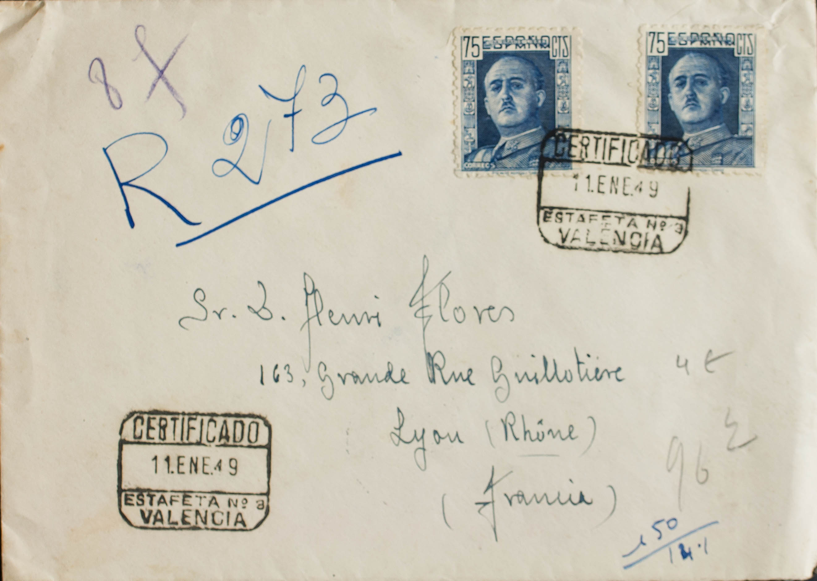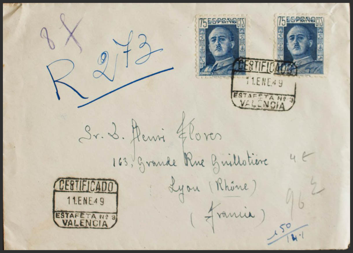 999(2). 1949. 75 cts azul, dos sellos. Certificado de VALENCIA a LYON (FRANCIA). Al dorso llegada. MAGNIFICA.