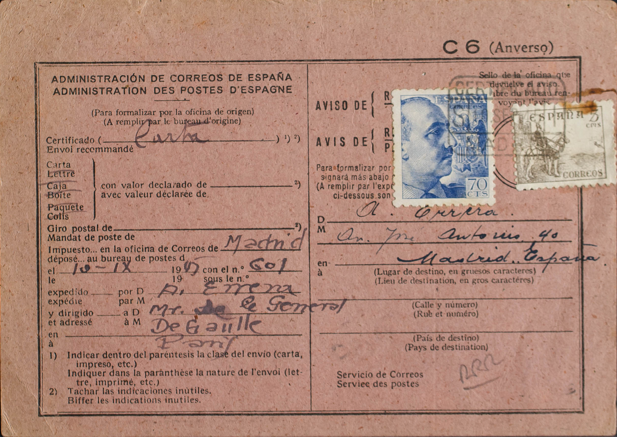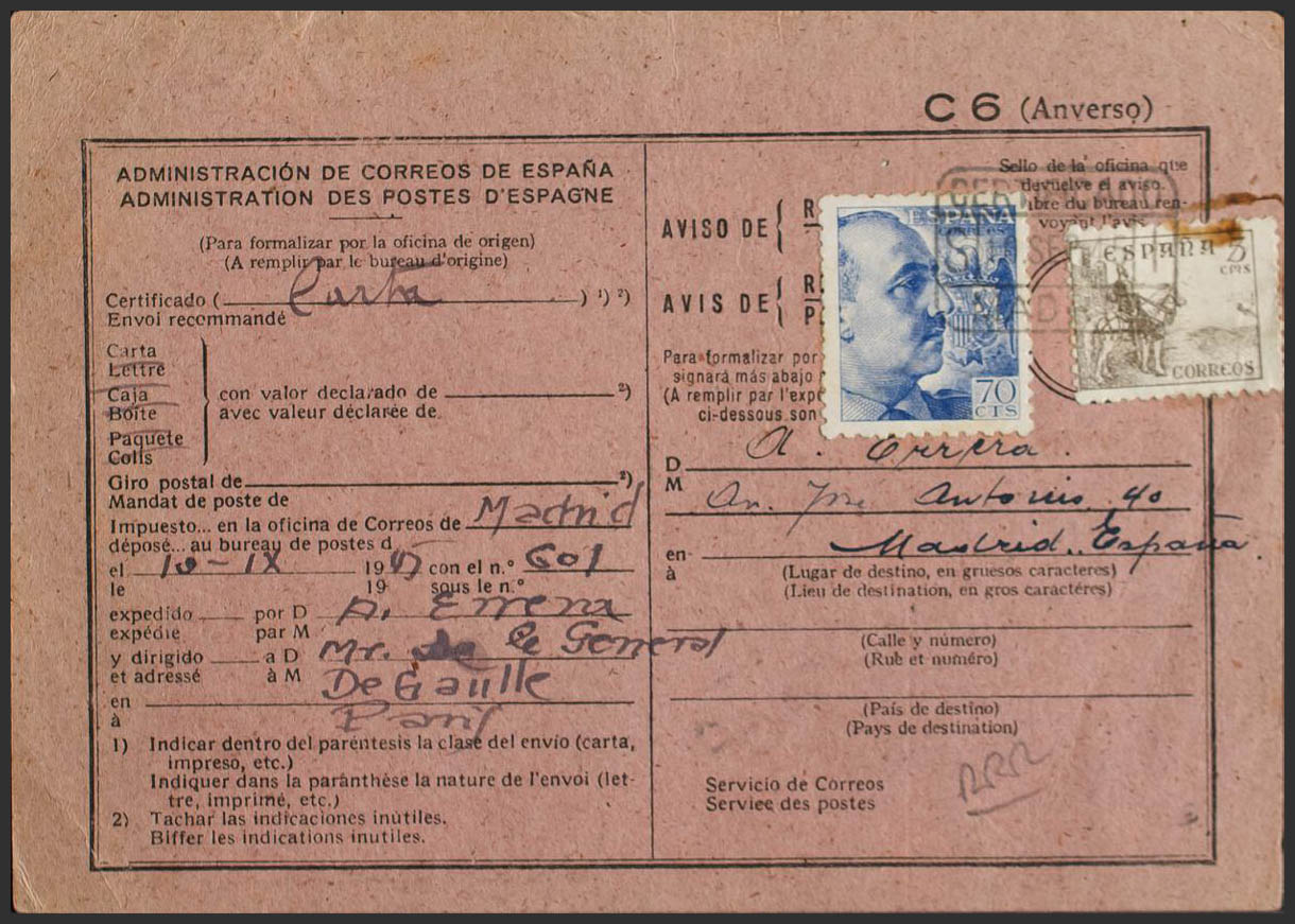 Estado Español Correo Certificado. AVISO DE CERTIFICADO, dirigido al General de Gaulle, al dorso llegada. MAGNIFICO.