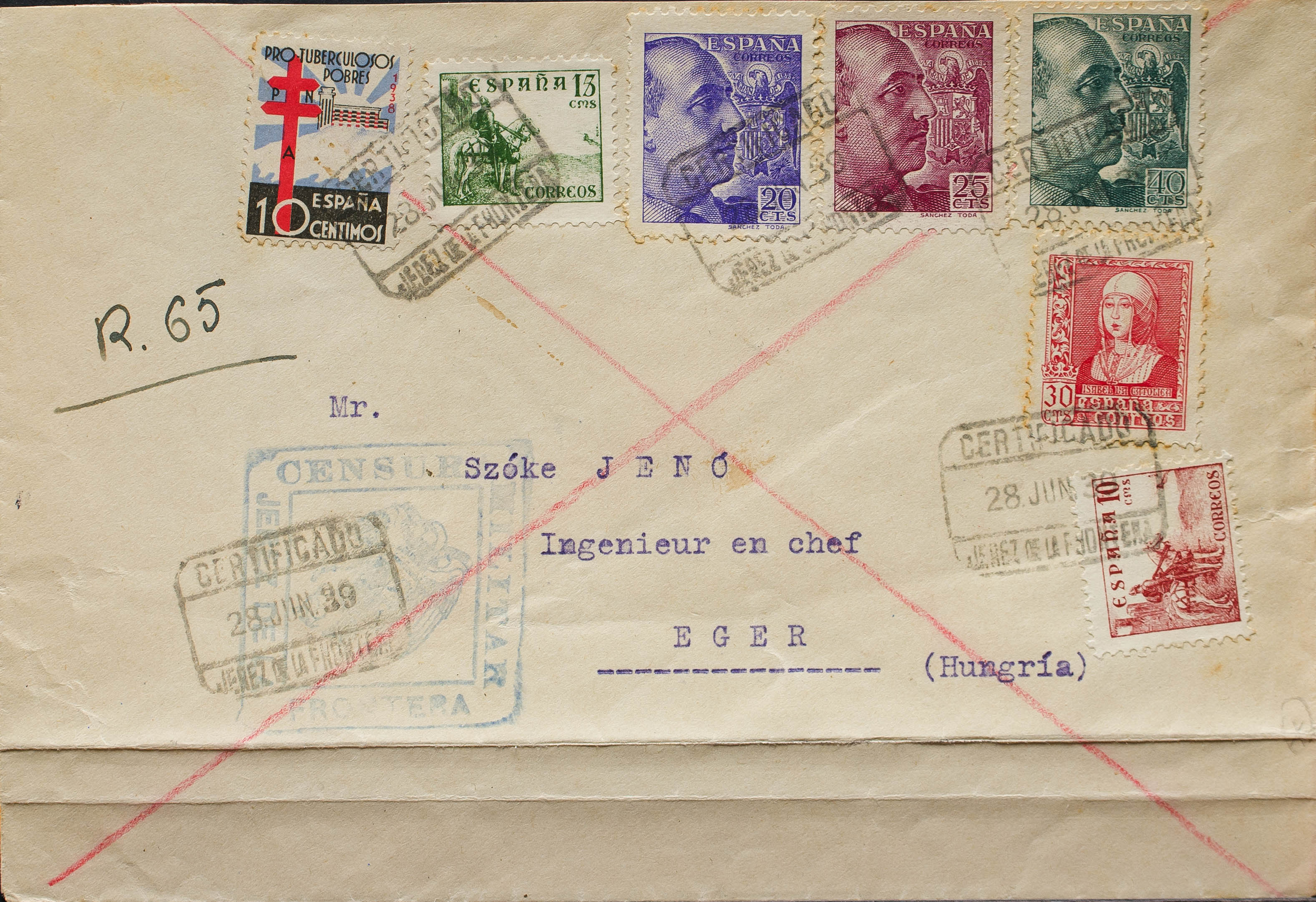 867,868,870,817,819,857,866. 1939. 20 cts violeta, 25 cts carmín, 40 cts verde gris y diversos valores. Certificado de JEREZ DE LA FRONTERA a EGER (HUNGRIA). Al dorso llegada. MAGNIFICA Y RARO DESTINO.