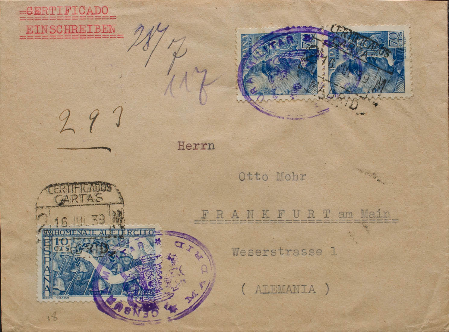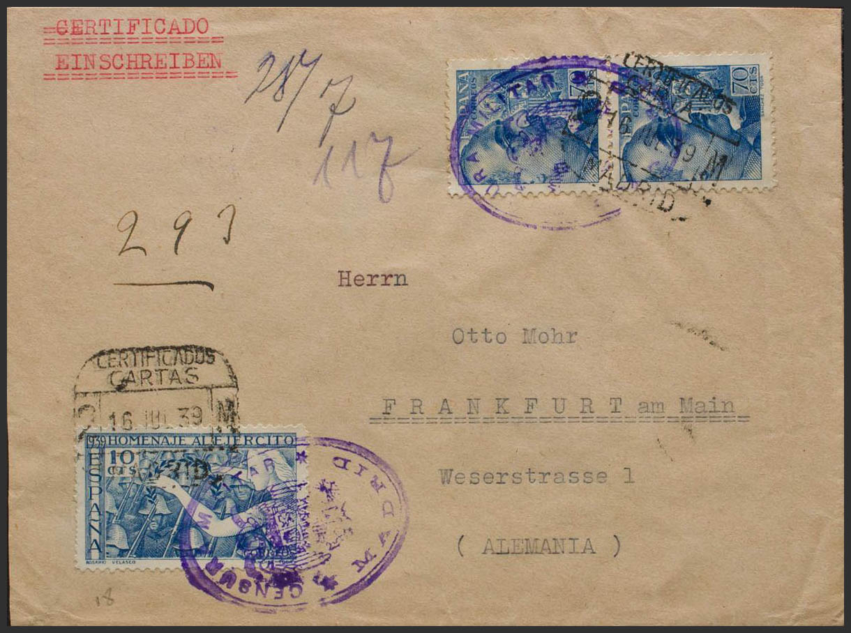 887, 929(2). 1939. 70 cts ultramar, dos sellos y 10 cts azul. Certificado de MADRID a FRANKFURT (ALEMANIA). Al dorso llegada. MAGNIFICA.