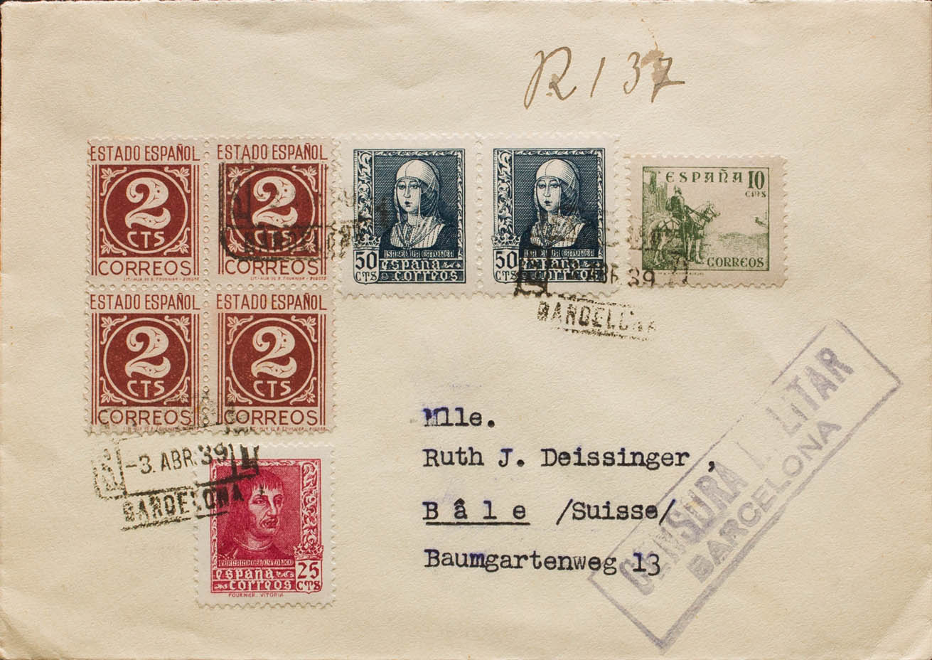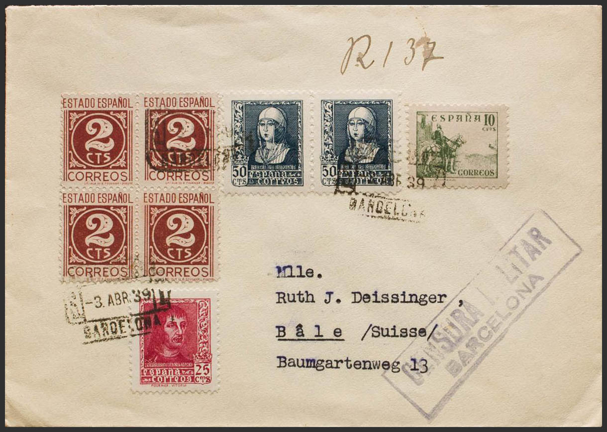859(2), 815(4), 817, 843. 1939. 50 cts pizarra, dos sellos y diversos valores. Certificado de BARCELONA a BASILEA (SUIZA). Al dorso llegada. MAGNIFICA Y RARA COMBINACION DE FRANQUEO CIRCULADA DOS DIAS DESPUES DEL FINAL DE LA GUERRA CIVIL.