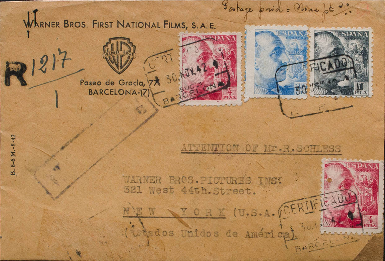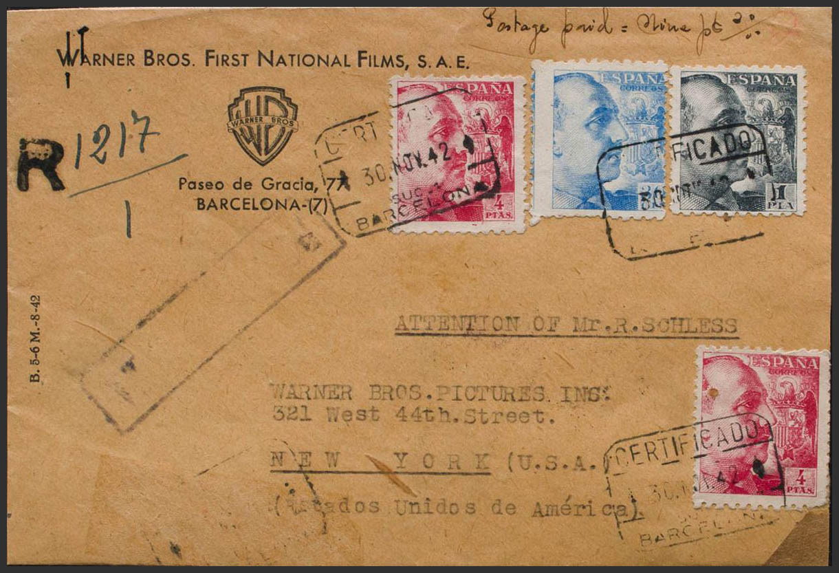 1942. 30 cts azul, 1 pts negro y 4 pts rosa, dos sellos. Sobre de la Warner Bros de BARCELONA a NUEVA YORK (U.S.A.). Al dorso llegada. MAGNIFICA.