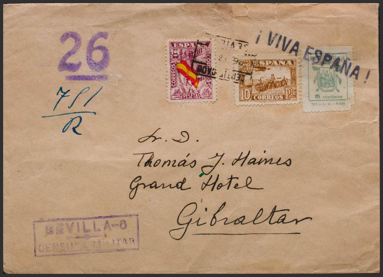 812, 813. 1938. 4 pts lila y 10 pts castaño. SEVILLA a GIBRALTAR. Al dorso llegada. MAGNIFICA Y MUY RARO FRANQUEO.