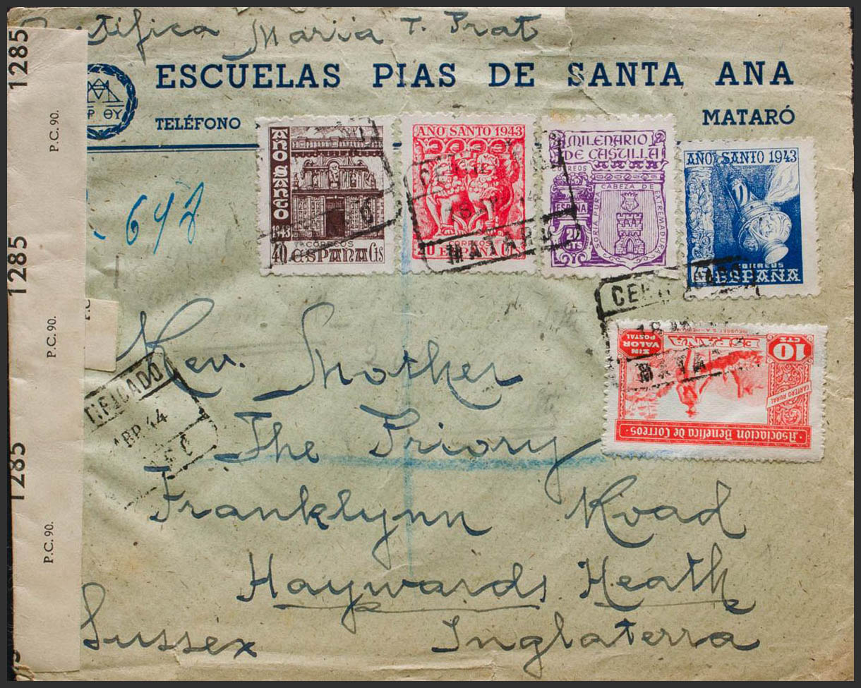 963, 964, 968, 974. 1944. 75 cts azul, 20 cts rojo, 40 cts castaño y 20 cts lila. Certificado de MATARO a SUSSEX (INGLATERRA). Al dorso llegada. MAGNIFICA Y RARO FRANQUEO.