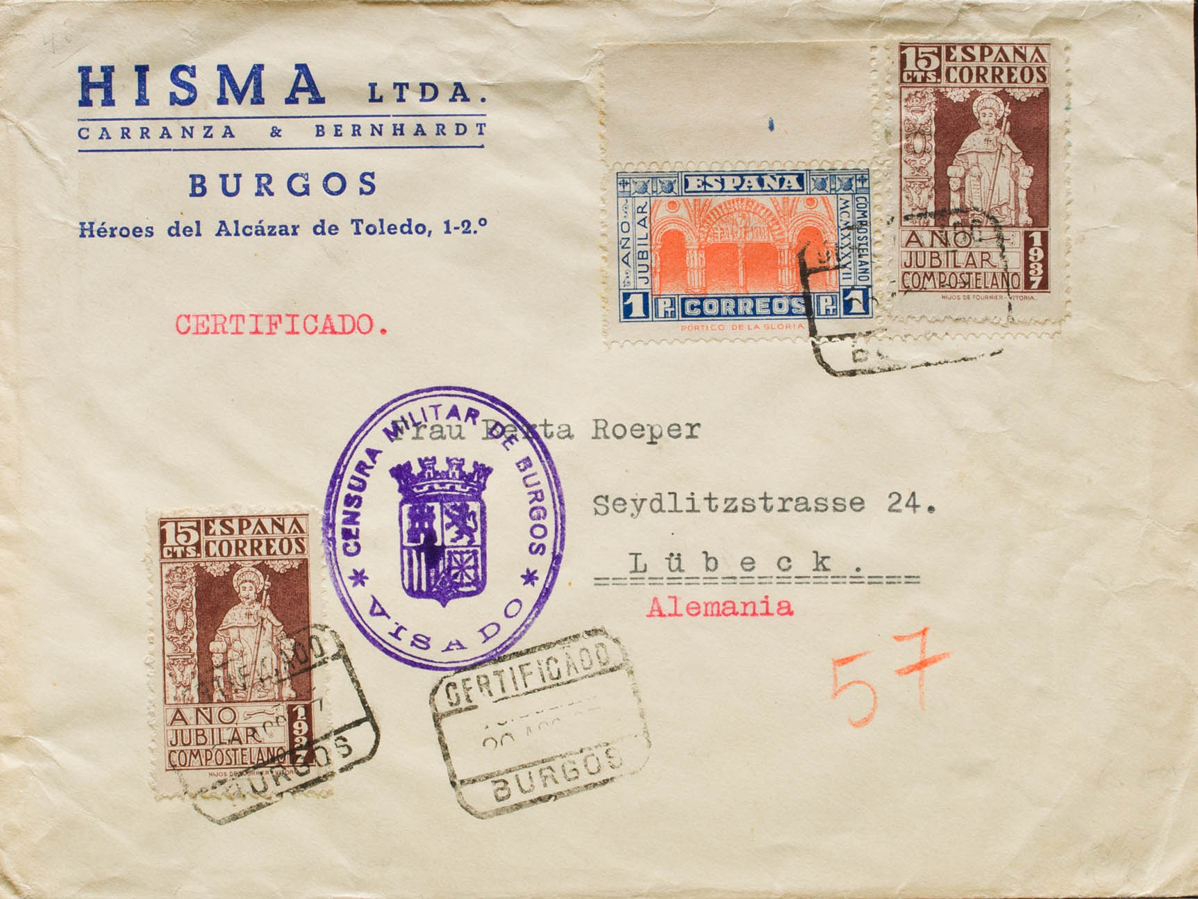 Estado Español Correo Certificado. Al dorso llegada. MAGNIFICA.