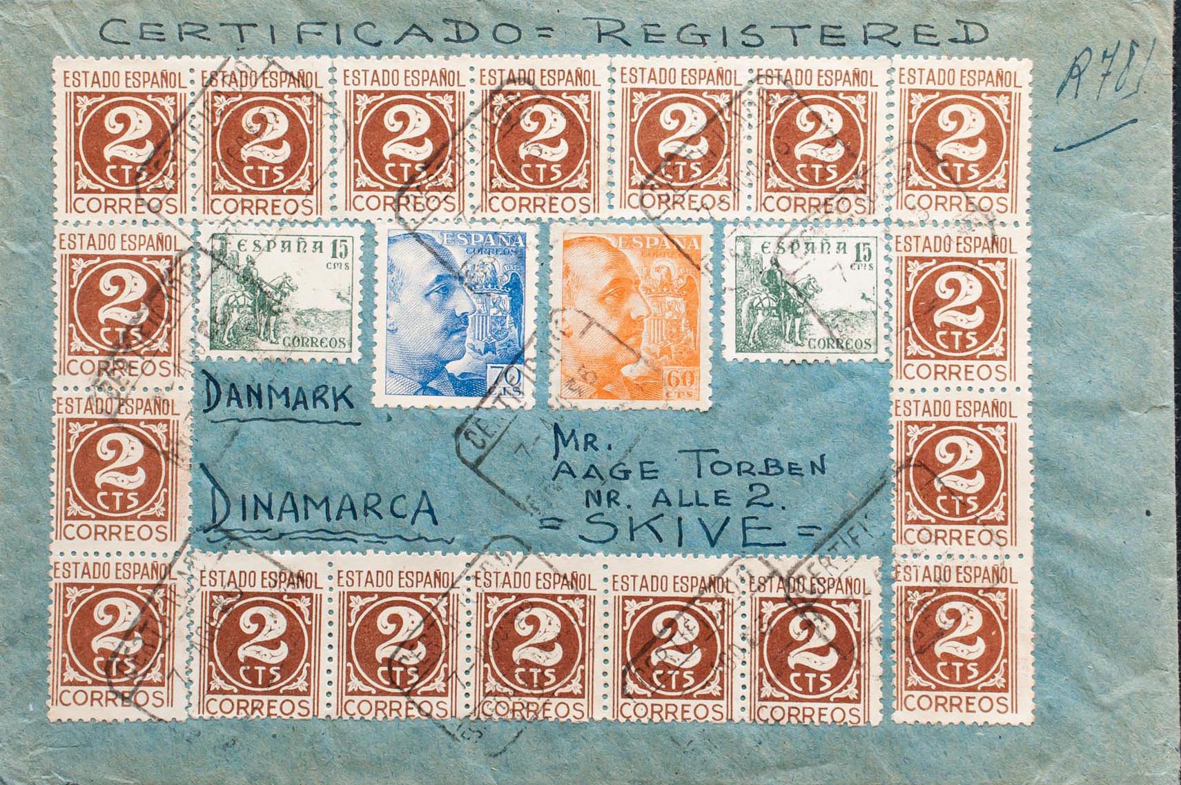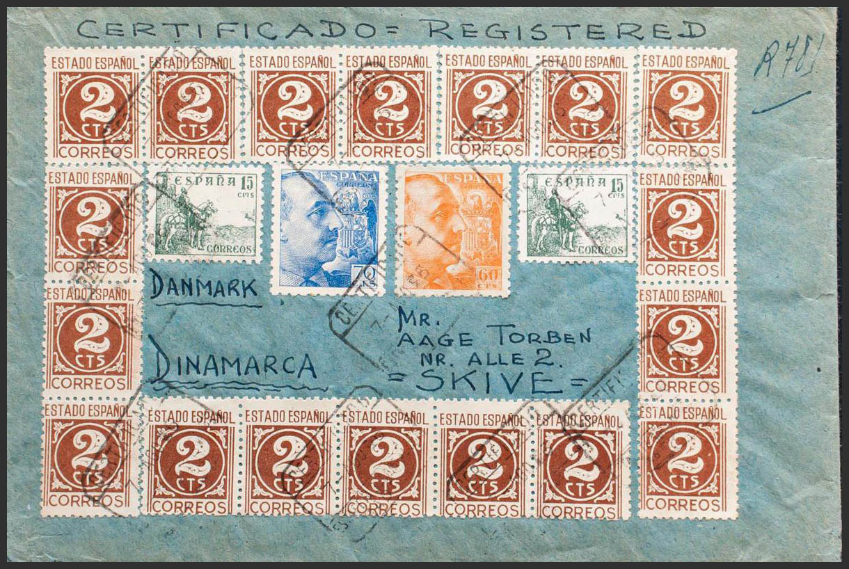 928, 929, 915(18), 918(2). 1946. 60 cts naranja, 70 cts azul, 2 cts castaño rojo, dieciocho sellos y 15 cts verde, dos sellos. Certificado de MADRID a SKIVE (DINAMARCA). Al dorso tránsito por Madrid. MAGNIFICA E INUSUAL FRANQUEO.