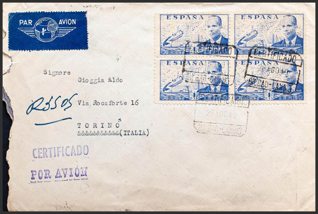 944(4). 1949. 1 pts azul ultramar, bloque de cuatro. Certificado de LAS ARENAS (VIZCAYA) a TURIN (ITALIA). Al dorso sello Benéfico de 10 cts utilizado como cierre y llegada. MAGNIFICA.