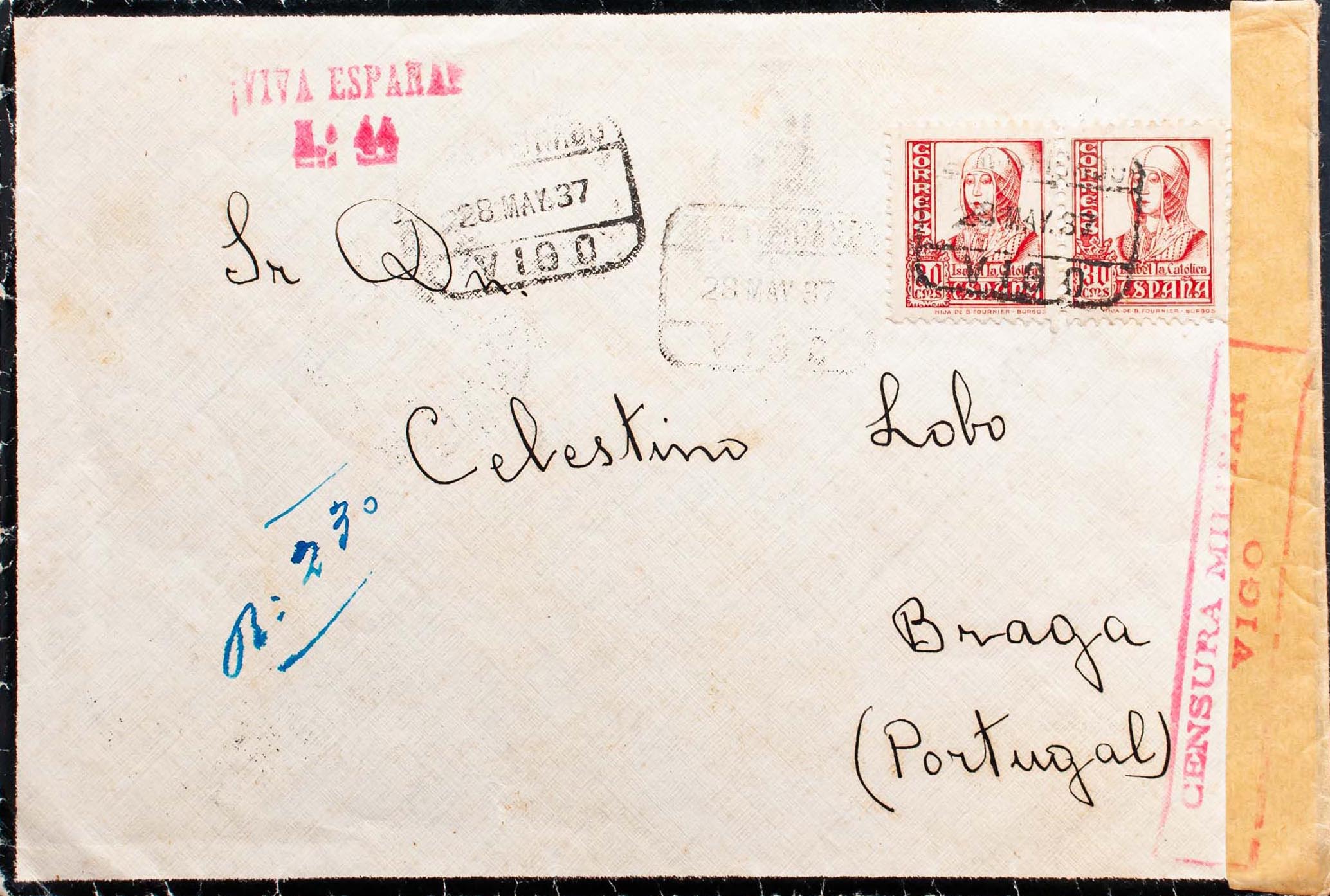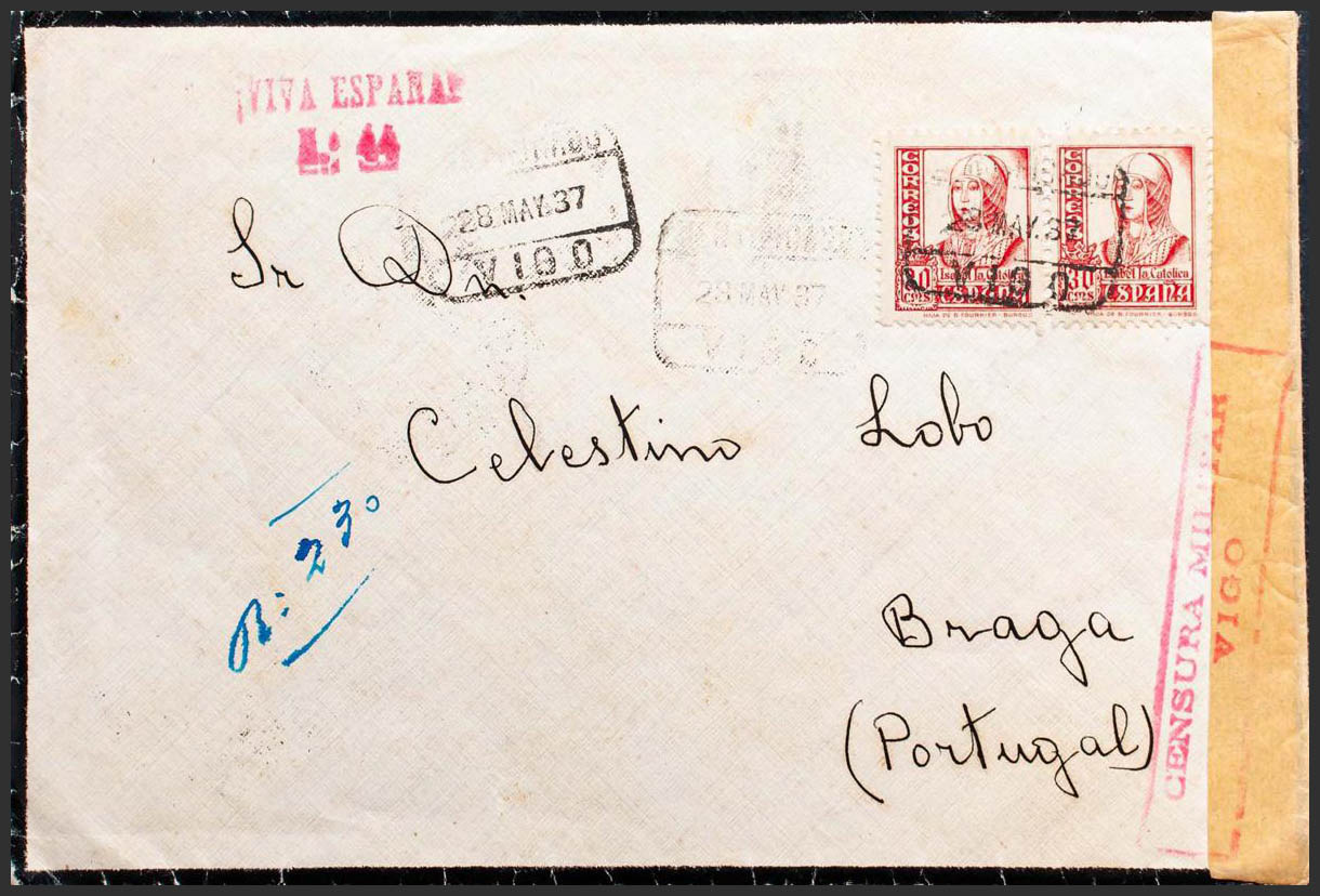 823. 1937. 30 cts rosa, pareja. Certificado de VIGO a BRAGA (PORTUGAL). Al dorso llegada. MAGNIFICA.