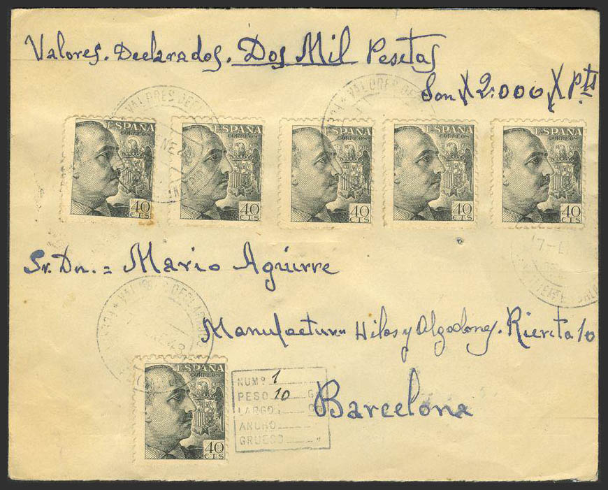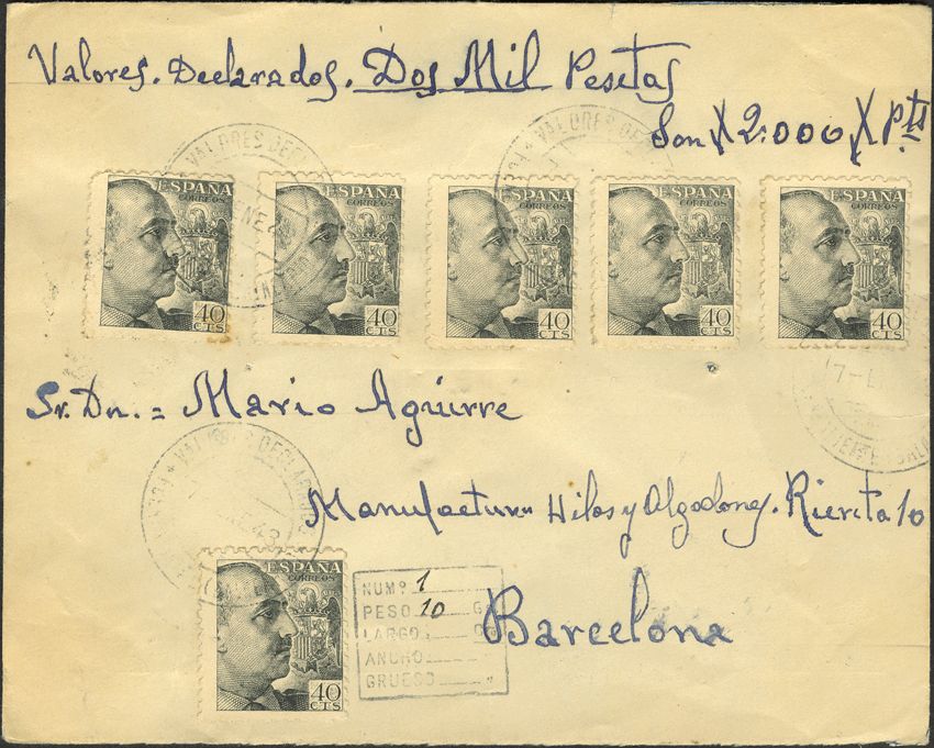 925(6). 1943. 40 cts., seis sellos. MADRID a BARCELONA. Matasello VALORES DECLARADOS / MADRID, al dorso llegada. MAGNIFICA.