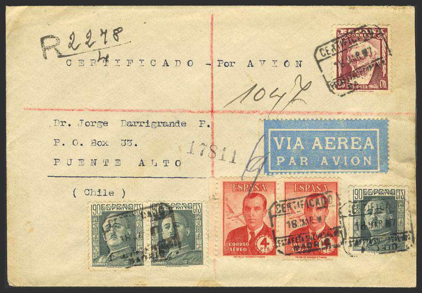 991(2), 999(3), 1005. 1947. 25 cts., 90 cts., pareja y un sello y 4 pts., pareja. MADRID a PUENTE ALTO (CHILE). Matasello CERTIFICADO / ESTAFETA SUCURSAL / MADRID, transportada "POR AVION", al dorso llegada. MAGNIFICA.