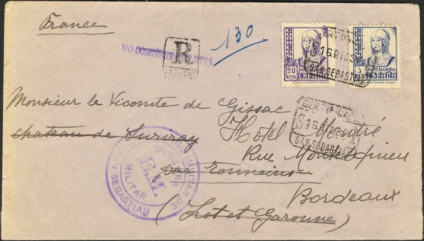 821, 828. 1937. 20 cts. violeta y 1 pts. azul. SAN SEBASTIAN a BORDEAUX. MAGNIFICA.