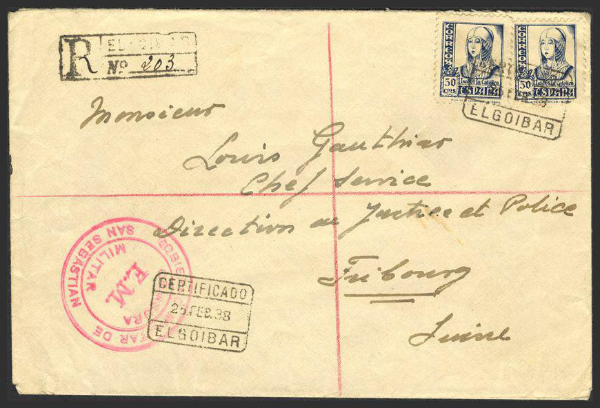 Estado Español Correo Certificado. Dirigida a Suiza, al dorso llegada.