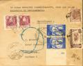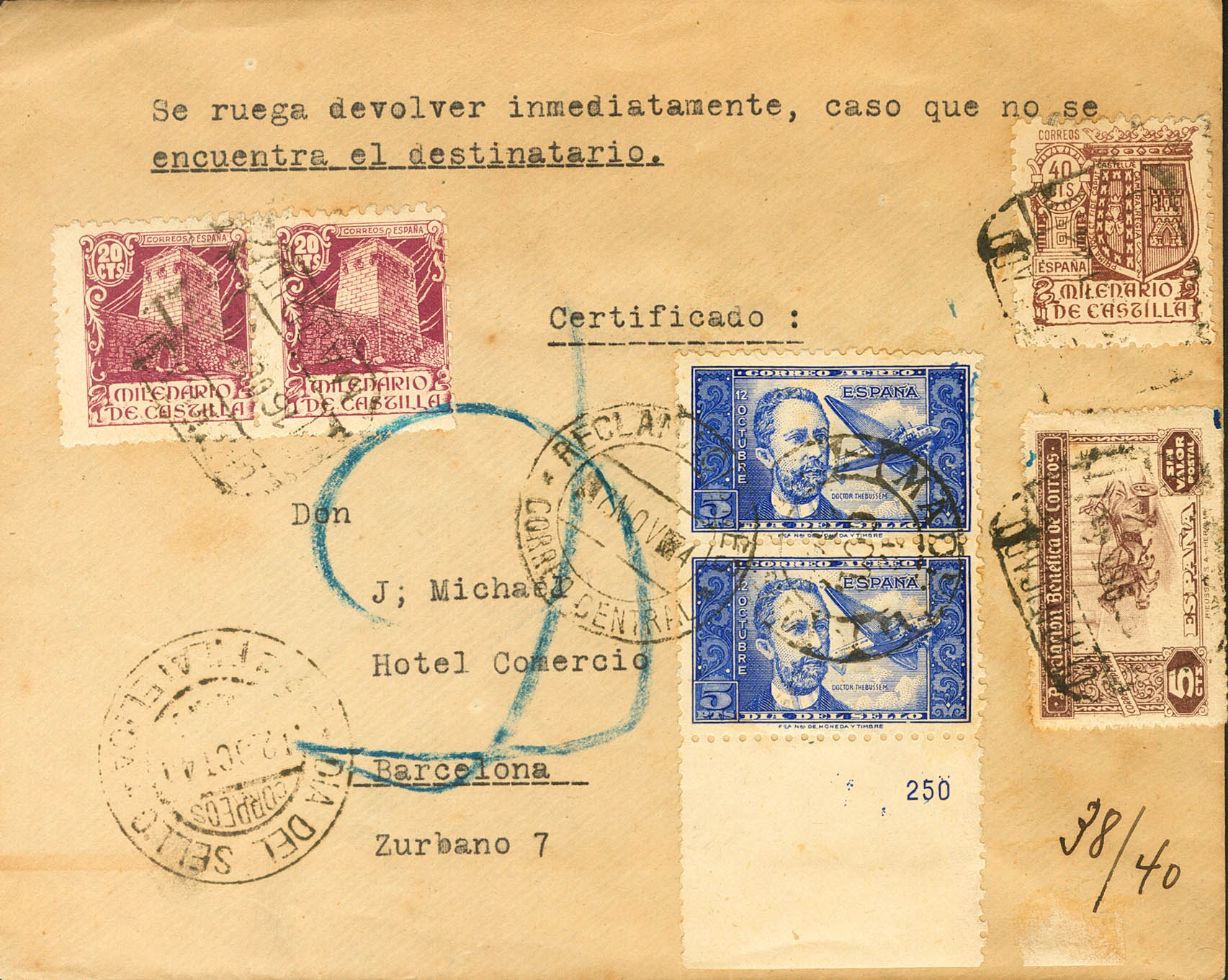 983(2). 1944. 5 pts azul, pareja, 20 cts lila, dos sellos, 40 cts castaño y Benéfico de 5 cts castaño. Certificado de MADRID a BARCELONA, devuelta al remitente. Al dorso marca de devolución y llegada. MAGNIFICA Y RARO FRANQUEO.