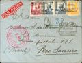 826, 828(2), 829. 1938. 60 cts amarillo, 1 pts azul, dos sellos y 4 pts lila rosa. Certificado de SAN SEBASTIAN a RIO DE JANEIRO (BRASIL). Al dorso sello de 10 cts de Cruzada Contra el Frío y llegada. MAGNIFICA.