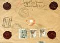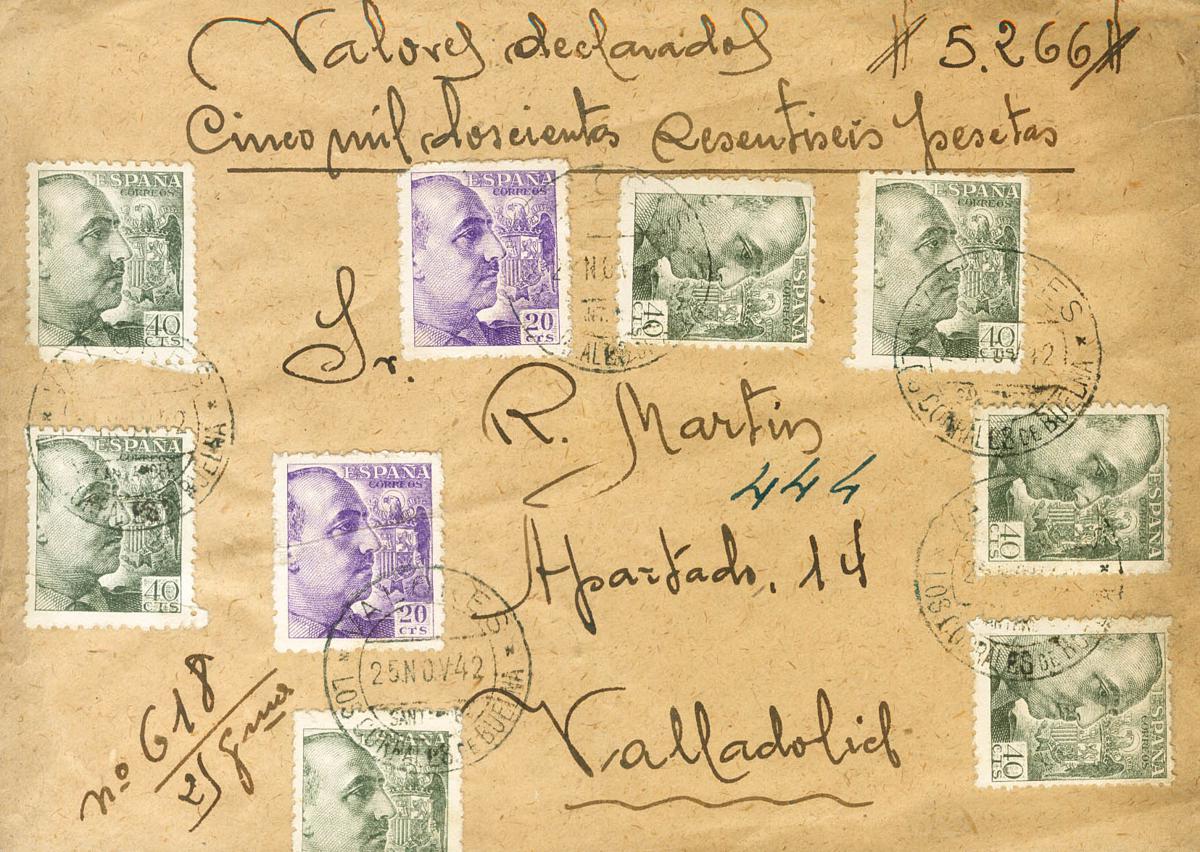 922(2), 925(7), 916. 1942. 20 cts violeta, dos sellos, 40 cts verde gris, ocho sellos (uno al dorso) y 5 cts castaño, dos sellos (al dorso). Valores Declarados de LOS CORRALES DE BUELMA (CANTABRIA) a VALLADOLID. Al dorso llegada. MAGNIFICA Y ESPECTACULAR.
