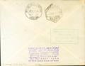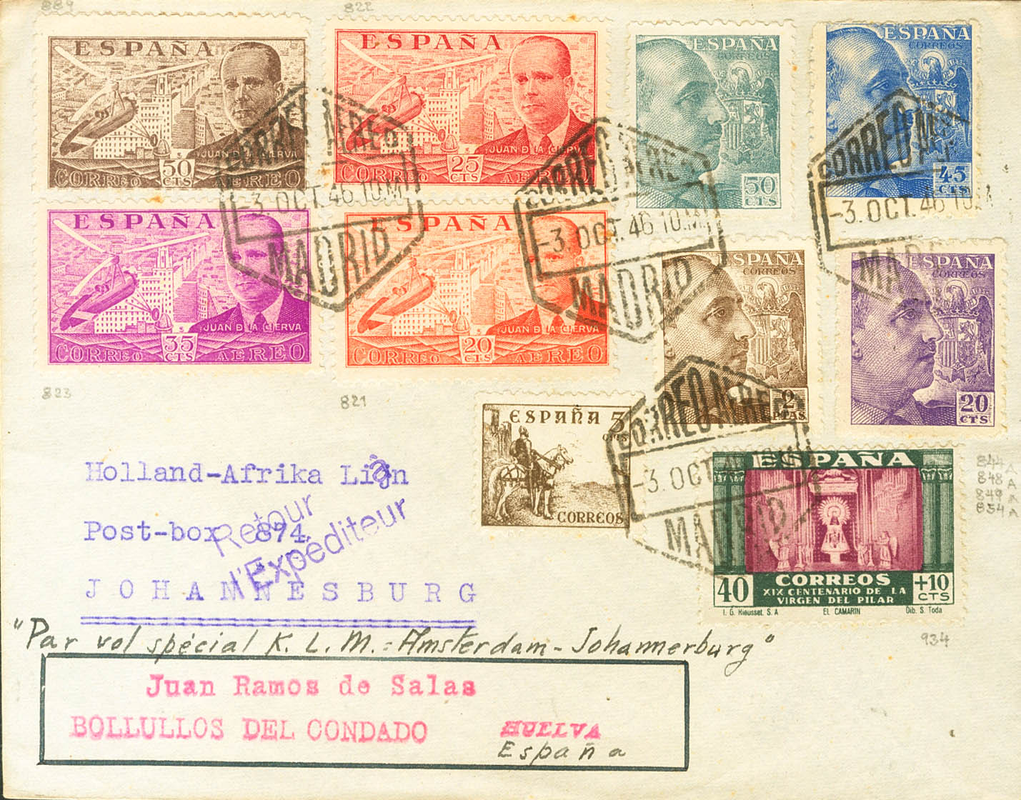 893. 1940. 40 cts + 10 cts y diversos valores. Correo Aéreo de MADRID a JOHANNESBURGO (SUDAFRICA). Al dorso marca de 1º vuelo, aplicada en Amsterdam. MAGNIFICA Y RARA.