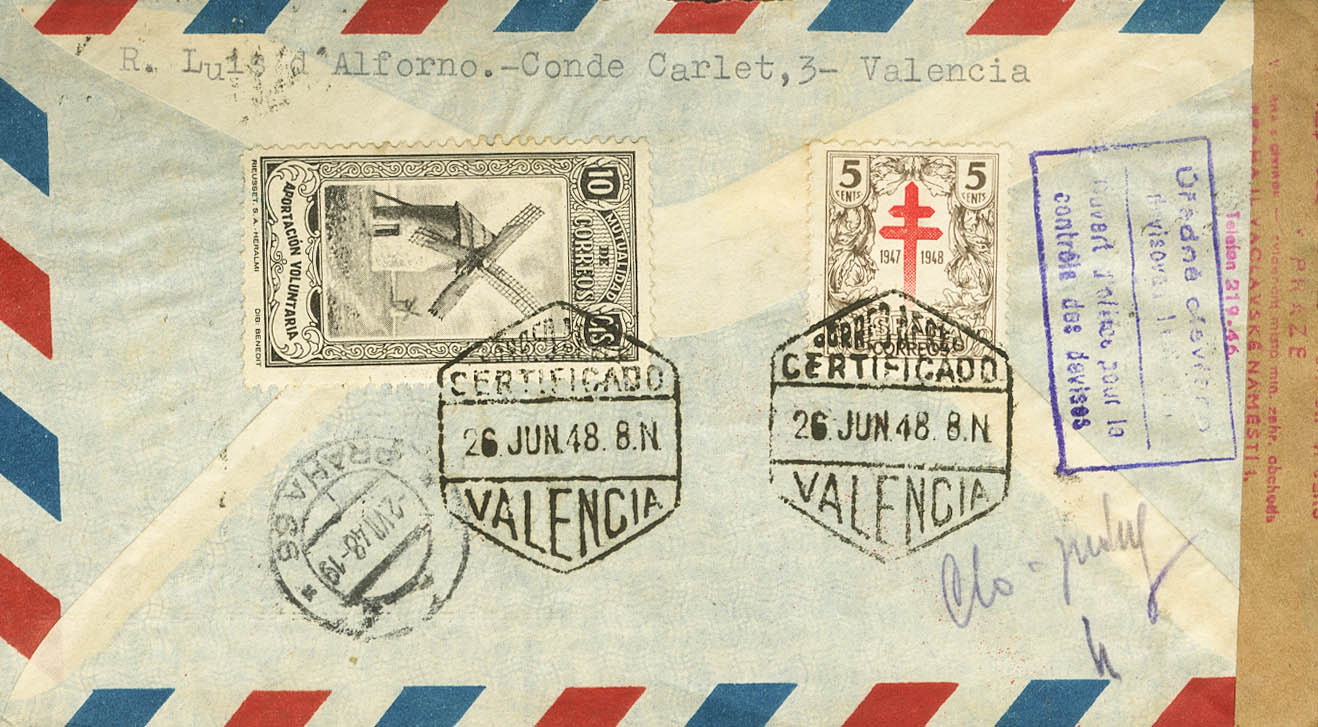 1035, 1036(3), 917, 1017. 1948. 35 cts negro, 70 cts violeta, tres sellos, 10 cts rosa y 5 cts castaño (al dorso). Certificado de VALENCIA a PRAGA (CHECOSLOVAQUIA). Al dorso llegada. MAGNIFICA.